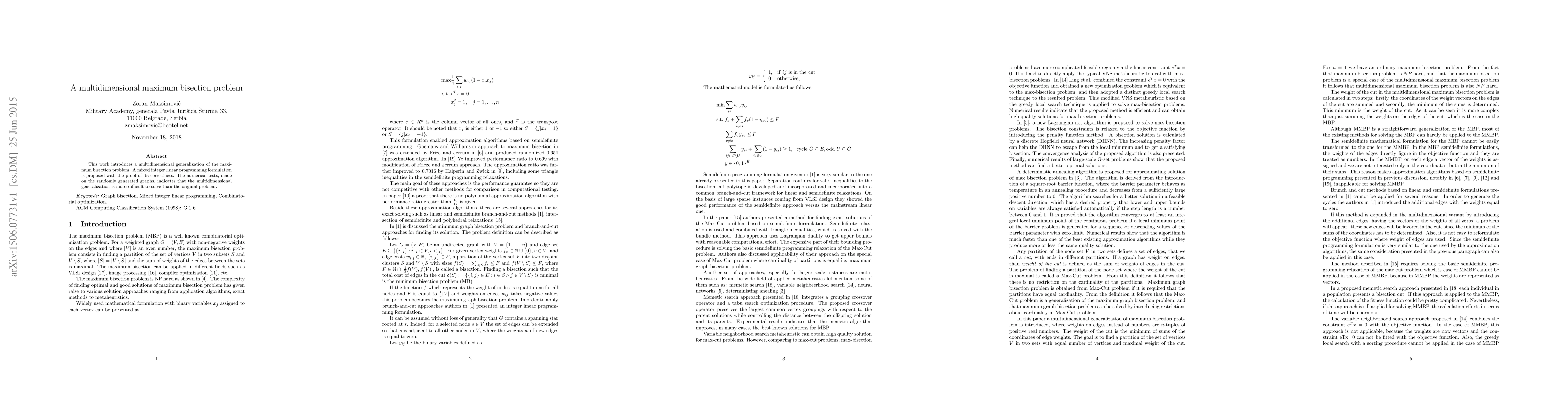 This work introduces a multidimensional generalization of the maximum bisection problem. A mixed integer linear programming formulation is proposed with the proof of its correctness. The numerical tests, made on the randomly generated graphs, indicates that the multidimensional generalization is more difficult to solve than the original problem.