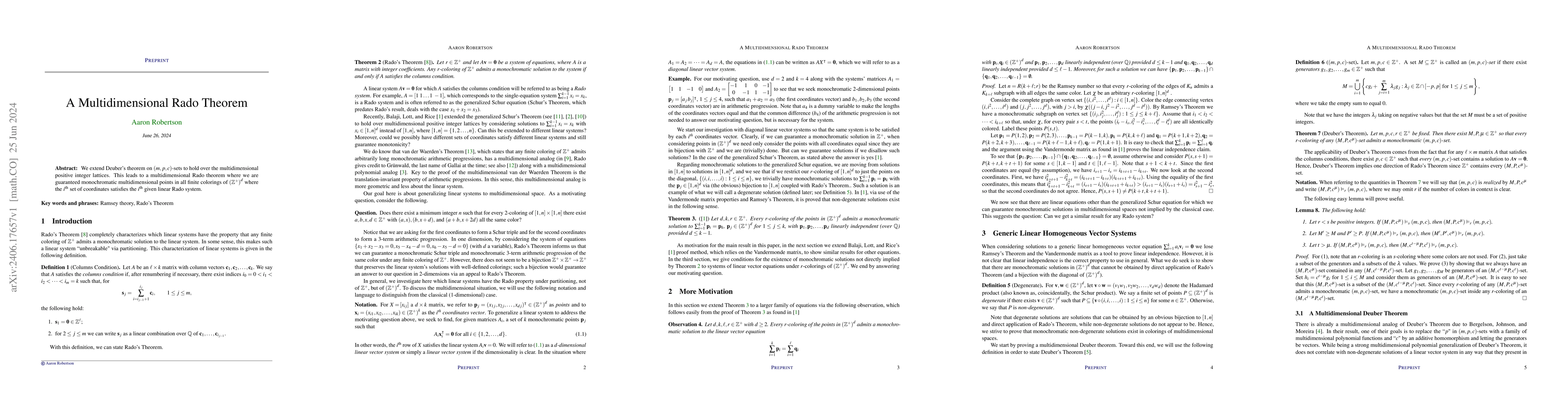 We extend Deuber's theorem on $(m,p,c)$-sets to hold over the multidimensional positive integer lattices. This leads to a multidimensional Rado theorem where we are guaranteed monochromatic multidimensional points in all finite colorings of $\left(\mathbb{Z}^+\right)^d$ where the $i^{\mathrm{th}}$ set of coordinates satisfies the $i^{\mathrm{th}}$ given linear Rado system.