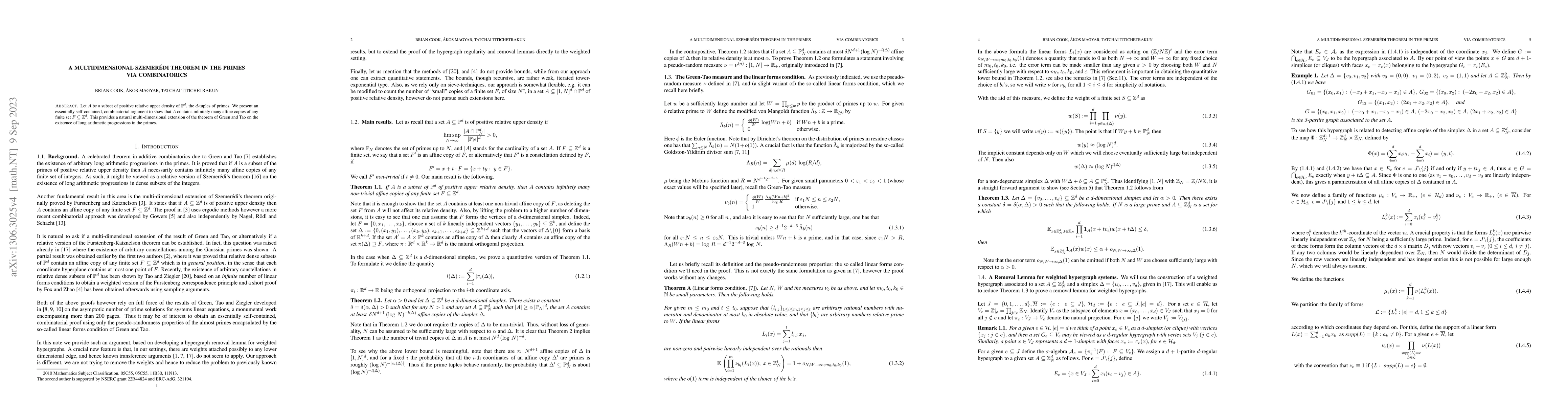 This paper extends Szemerédi's theorem to subsets of $d$-tuples of primes, proving the existence of affine copies of any finite set $F \subseteq \mathbb{Z}^d$ within such subsets. The proof leverages a pseudo-random weight system on a $d+1$-partite hypergraph and extends the hypergraph removal lemma, avoiding the use of a transference principle.