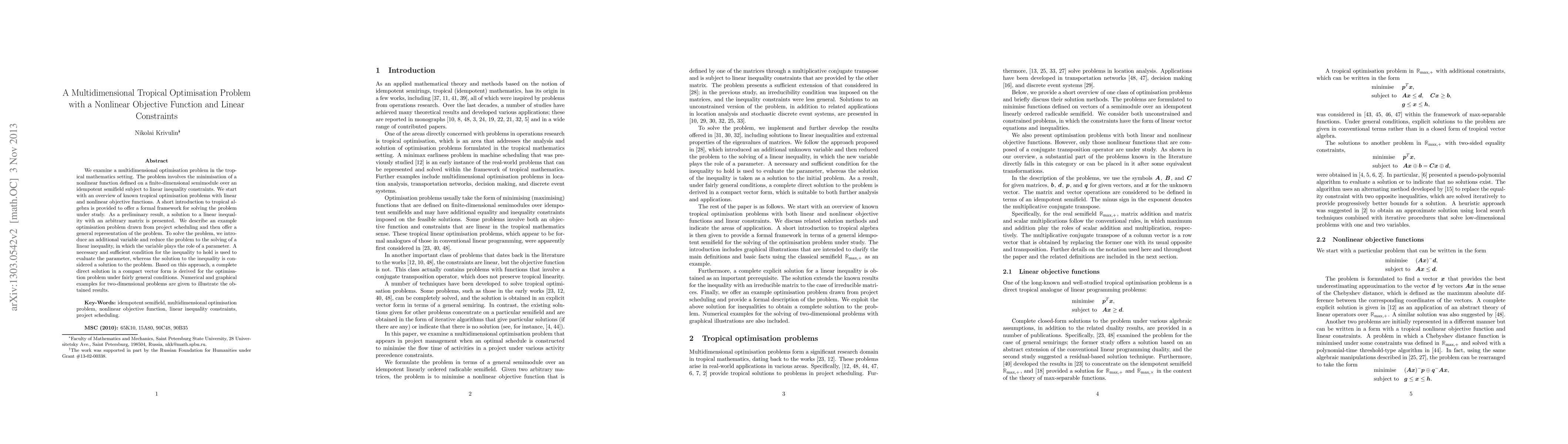 We examine a multidimensional optimisation problem in the tropical mathematics setting. The problem involves the minimisation of a nonlinear function defined on a finite-dimensional semimodule over an idempotent semifield subject to linear inequality constraints. We start with an overview of known tropical optimisation problems with linear and nonlinear objective functions. A short introduction to tropical algebra is provided to offer a formal framework for solving the problem under study. As a preliminary result, a solution to a linear inequality with an arbitrary matrix is presented. We describe an example optimisation problem drawn from project scheduling and then offer a general representation of the problem. To solve the problem, we introduce an additional variable and reduce the problem to the solving of a linear inequality, in which the variable plays the role of a parameter. A necessary and sufficient condition for the inequality to hold is used to evaluate the parameter, whereas the solution to the inequality is considered a solution to the problem. Based on this approach, a complete direct solution in a compact vector form is derived for the optimisation problem under fairly general conditions. Numerical and graphical examples for two-dimensional problems are given to illustrate the obtained results.