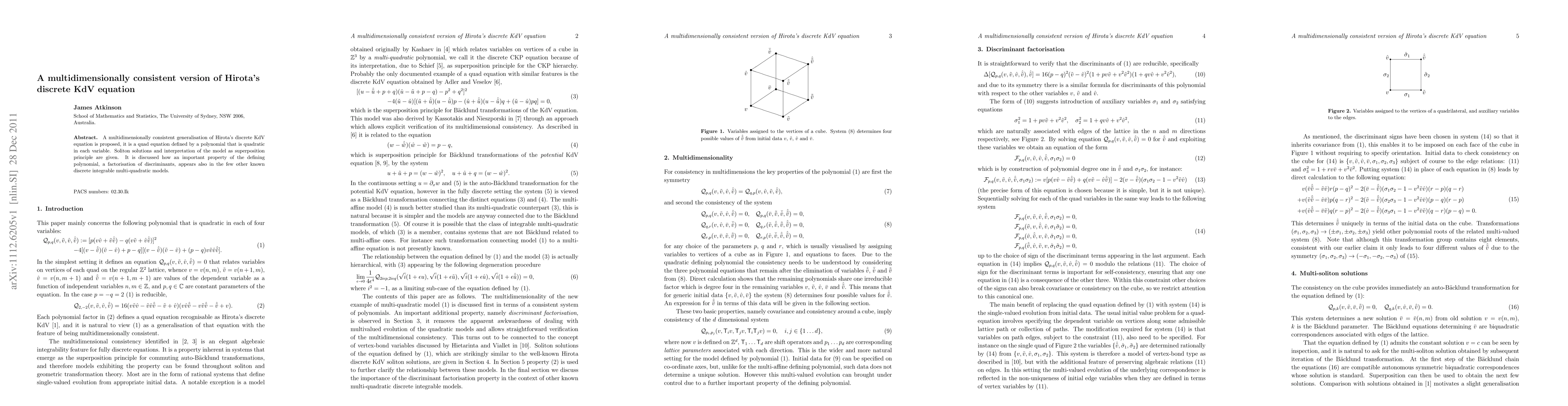 This paper proposes a multidimensionally consistent generalisation of Hirota's discrete KdV equation, presenting a quad equation that is quadratic in each variable. It provides soliton solutions and discusses the model's interpretation as a superposition principle, highlighting the significance of discriminant factorisation in related discrete integrable models.