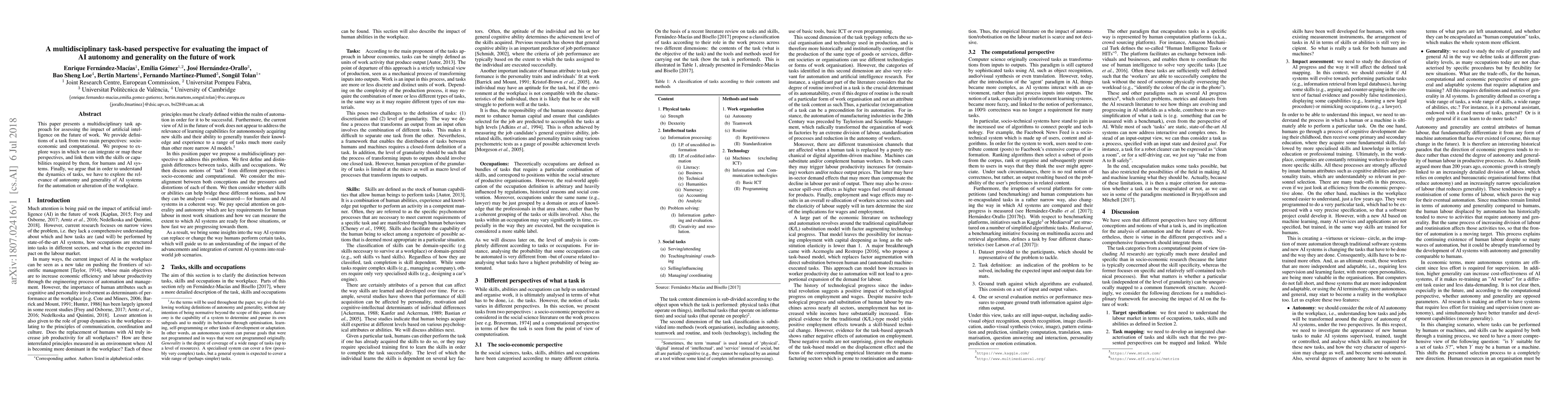 This paper presents a multidisciplinary task approach for assessing the impact of artificial intelligence on the future of work. We provide definitions of a task from two main perspectives: socio-economic and computational. We propose to explore ways in which we can integrate or map these perspectives, and link them with the skills or capabilities required by them, for humans and AI systems. Finally, we argue that in order to understand the dynamics of tasks, we have to explore the relevance of autonomy and generality of AI systems for the automation or alteration of the workplace.
