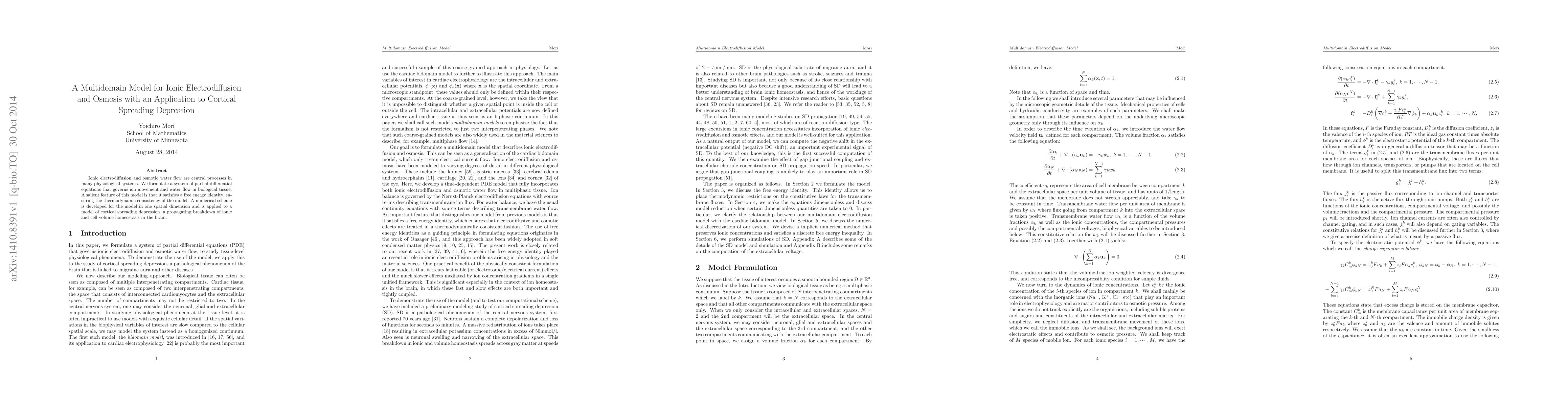 This paper presents a multidomain model for ionic electrodiffusion and osmosis, governed by a system of partial differential equations that ensures thermodynamic consistency. The model is numerically applied to simulate cortical spreading depression, a brain phenomenon involving ionic and cell volume disruptions.