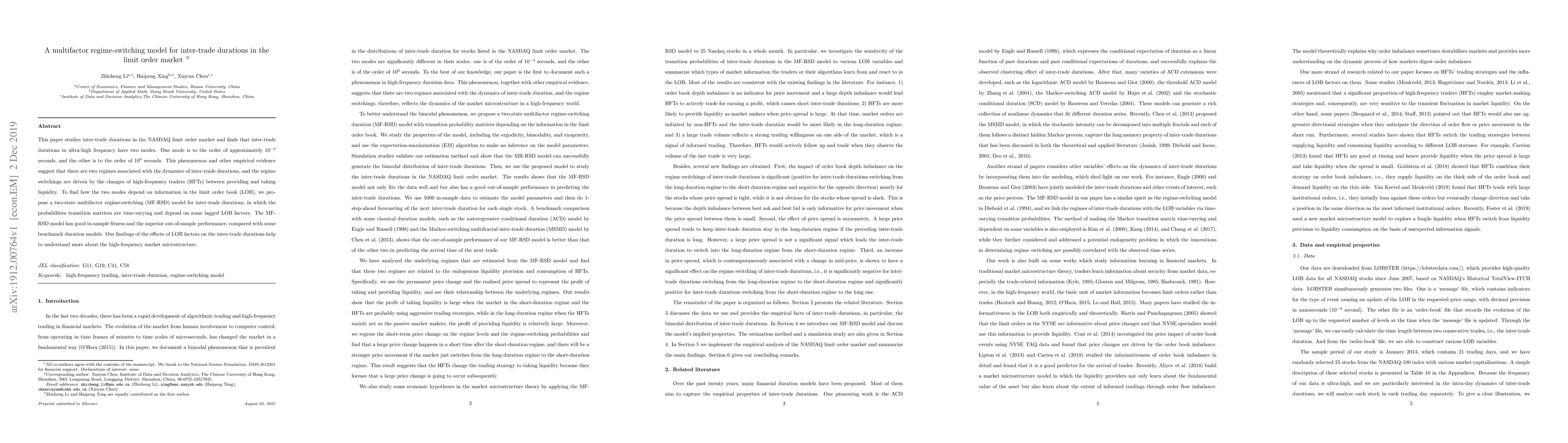 This paper proposes a multifactor regime-switching model to analyze inter-trade durations in the NASDAQ limit order market, revealing two distinct modes: approximately 10^{-4} seconds and 1 second, driven by high-frequency traders' liquidity dynamics. The model shows superior performance and provides insights into the impact of limit order book factors on inter-trade durations.