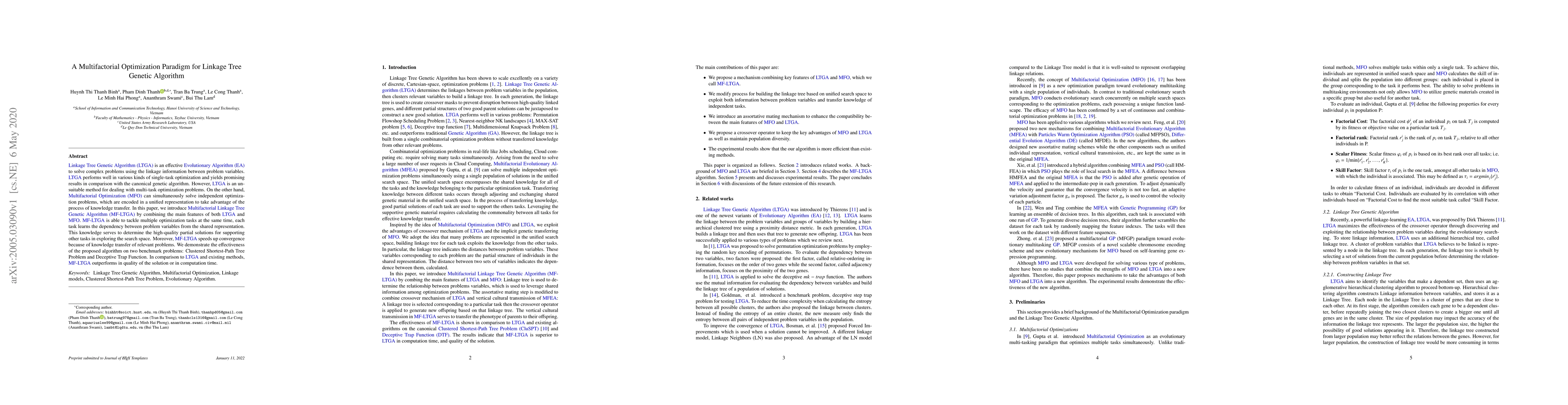 This paper introduces the Multifactorial Linkage Tree Genetic Algorithm (MF-LTGA), combining LTGA and MFO to optimize multiple tasks simultaneously. MF-LTGA leverages knowledge transfer between tasks to enhance convergence and improve solution quality, outperforming LTGA and existing methods on benchmark problems.