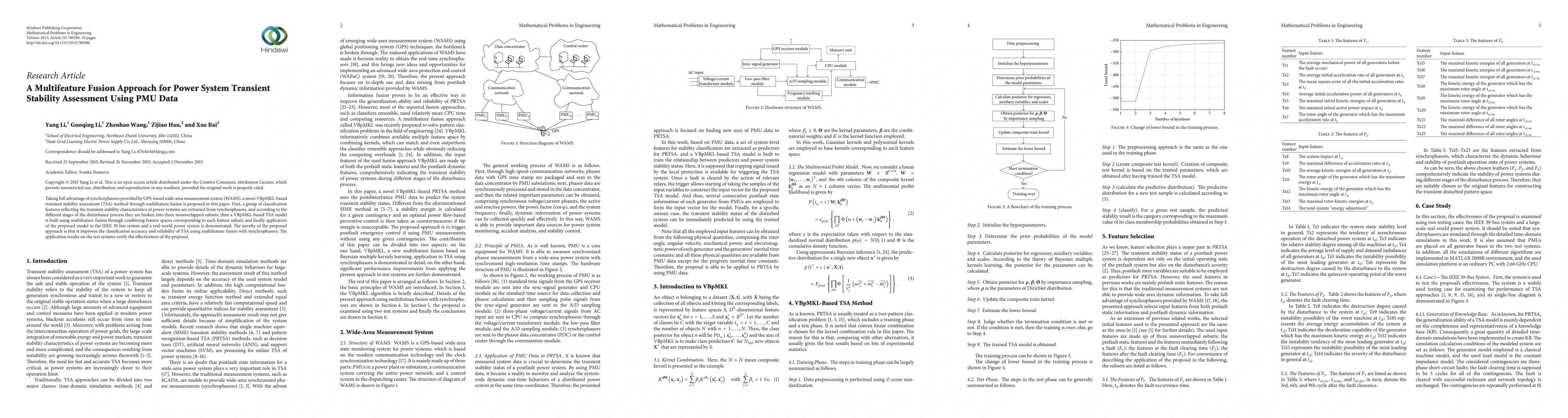 This paper proposes a novel transient stability assessment method using synchrophasors from GPS-based wide-area measurement systems (WAMS) through multifeature fusion. The method extracts classification features from synchrophasors and combines them using a VBpMKL-based model, improving classification accuracy and reliability, as demonstrated on IEEE 39-bus and real-world power systems.