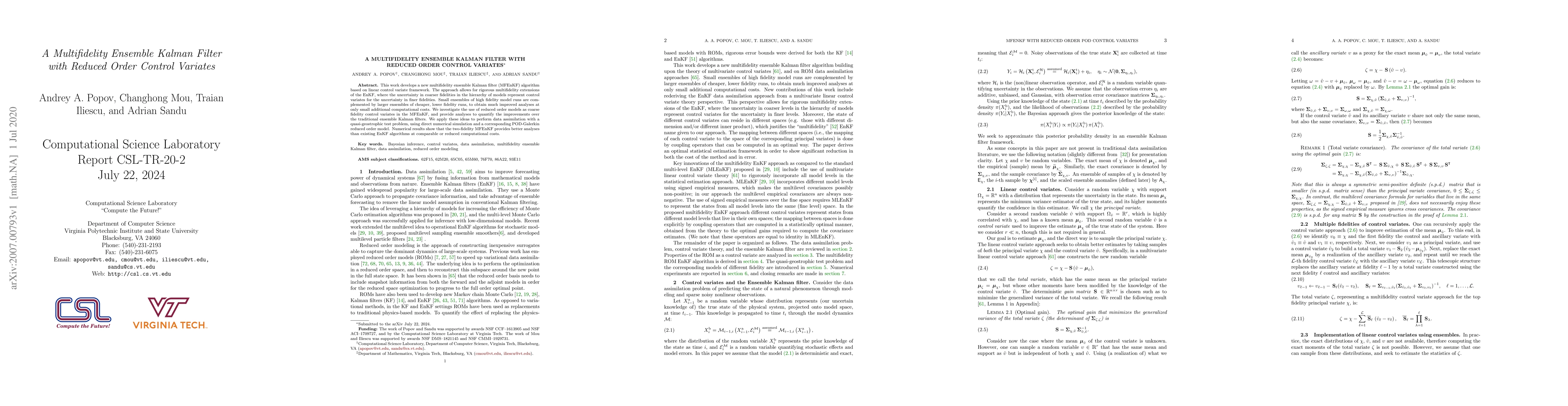 This paper introduces a multifidelity ensemble Kalman filter (MFEnKF) using reduced order models to enhance data assimilation efficiency. The method leverages coarser models to reduce computational costs while providing improved analysis accuracy compared to traditional ensemble Kalman filters.