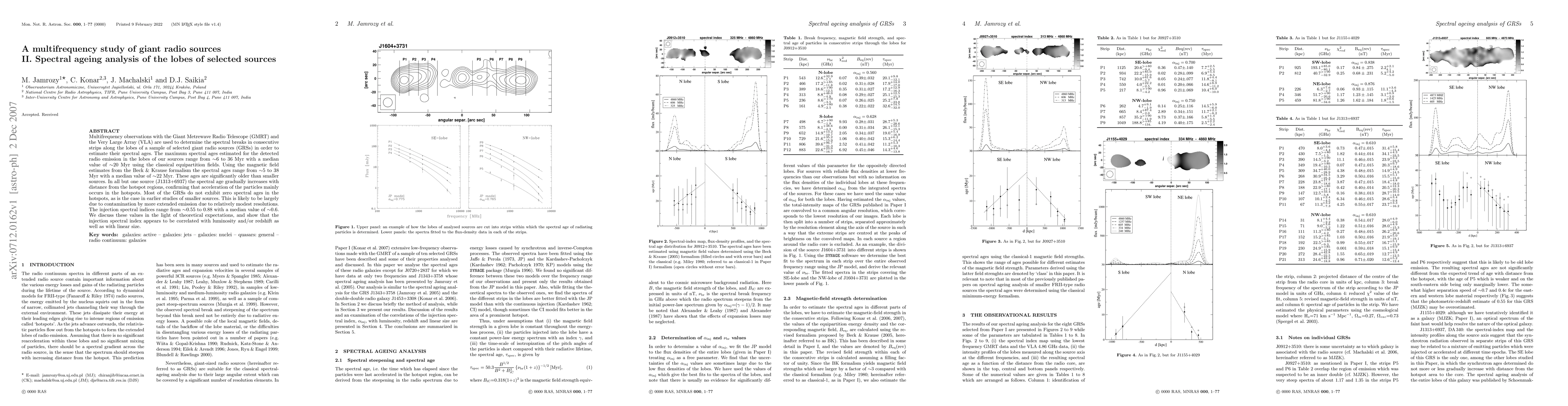 This study uses multifrequency observations to determine spectral breaks in the lobes of selected giant radio sources, estimating their spectral ages ranging from 6 to 36 Myr. The findings suggest that particle acceleration mainly occurs near hotspots, with ages increasing with distance from these regions, and that the injection spectral index correlates with luminosity, redshift, and size.