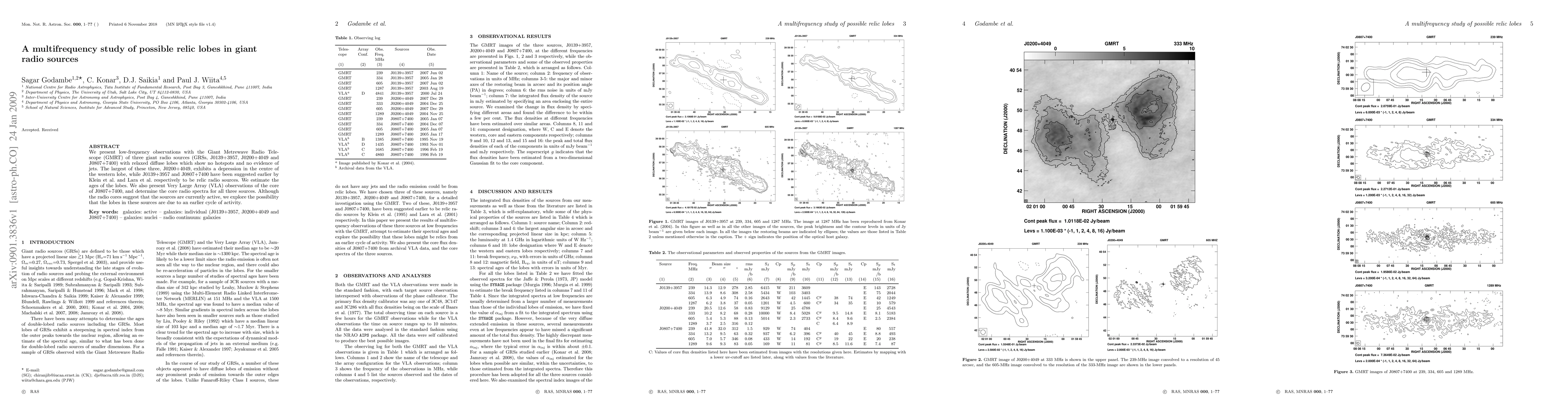 This study uses low-frequency GMRT observations to investigate three giant radio sources with diffuse lobes lacking hotspots and jets, suggesting they may be relic lobes from an earlier activity cycle. The research estimates the ages of the lobes and finds evidence supporting their relic nature.
