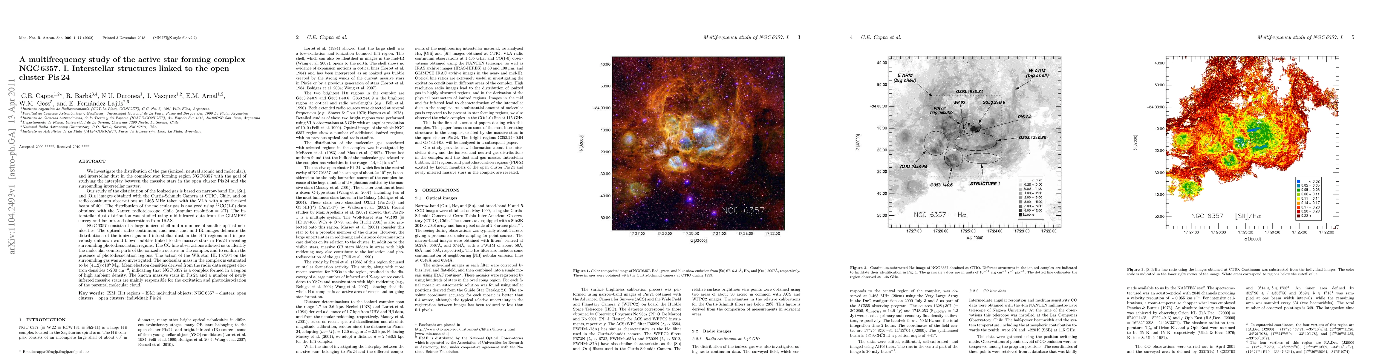 We investigate the distribution of the gas (ionized, neutral atomic and molecular), and interstellar dust in the complex star forming region NGC6357 with the goal of studying the interplay between the massive stars in the open cluster Pis24 and the surrounding interstellar matter. Our study of the distribution of the ionized gas is based on narrow-band Hhalfa, [SII], and [OIII] images obtained with the Curtis-Schmidt Camera at CTIO, Chile, and on radio continuum observations at 1465 MHz taken with the VLA with a synthesized beam of 40 arcsec. The distribution of the molecular gas is analyzed using 12CO(1-0) data obtained with the Nanten radiotelescope, Chile (angular resolution = 2.7 arcmin). The interstellar dust distribution was studied using mid-infrared data from the GLIMPSE survey and far-infrared observations from IRAS. NGC6357 consists of a large ionized shell and a number of smaller optical nebulosities. The optical, radio continuum, and near- and mid-IR images delineate the distributions of the ionized gas and interstellar dust in the HII regions and in previously unknown wind blown bubbles linked to the massive stars in Pis24 revealing surrounding photodissociation regions. The CO line observations allowed us to identify the molecular counterparts of the ionized structures in the complex and to confirm the presence of photodissociation regions. The action of the WR star HD157504 on the surrounding gas was also investigated. The molecular mass in the complex is estimated to be (4+/-2)X10^5 Mo. Mean electron densities derived from the radio data suggest electron densities > 200 cm^-3, indicating that NGC6357 is a complex formed in a region of high ambient density. The known massive stars in Pis24 and a number of newly inferred massive stars are mainly responsible for the excitation and photodissociation of the parental molecular cloud.