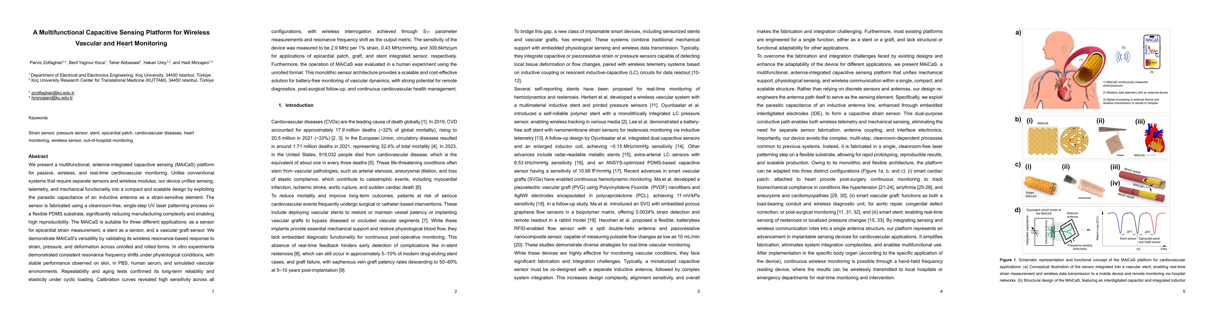 We present a multifunctional, antenna-integrated capacitive sensing (MAiCaS) platform for passive, wireless, and real-time cardiovascular monitoring. Unlike conventional systems that require separate sensors and wireless modules, our device unifies sensing, telemetry, and mechanical functionality into a compact and scalable design by exploiting the parasitic capacitance of an inductive antenna as a strain-sensitive element. The sensor is fabricated using a cleanroom-free, single-step UV laser patterning process on a flexible PDMS substrate, reducing manufacturing complexity and enabling high reproducibility. The MAiCaS is suitable for three different applications: as a sensor for epicardial strain measurement, a stent as a sensor, and a vascular graft sensor. We demonstrate MAiCaS's versatility by validating its wireless resonance-based response to strain, pressure, and deformation across unrolled and rolled forms. In vitro experiments demonstrated consistent resonance frequency shifts under physiological conditions, with stable performance on skin, in PBS, human serum, and simulated vascular environments. Repeatability and aging tests confirmed its long-term reliability and elasticity under cyclic loading. Calibration curves revealed high sensitivity across all configurations, with wireless interrogation achieved through S11 parameter measurements and resonance frequency shift as the output metric. The sensitivity of the device was measured to be 2.9 MHz per 1% strain, 0.43 MHz/mmHg, and 309.6kHz/\textmu m for epicardial patch, graft, and stent integrated sensor, respectively. The operation of MAiCaS was evaluated in a human experiment. This monolithic sensor architecture provides a scalable and cost-effective solution for battery-free monitoring of vascular dynamics, with potential for remote diagnostics, post-surgical follow-up, and continuous cardiovascular health management.