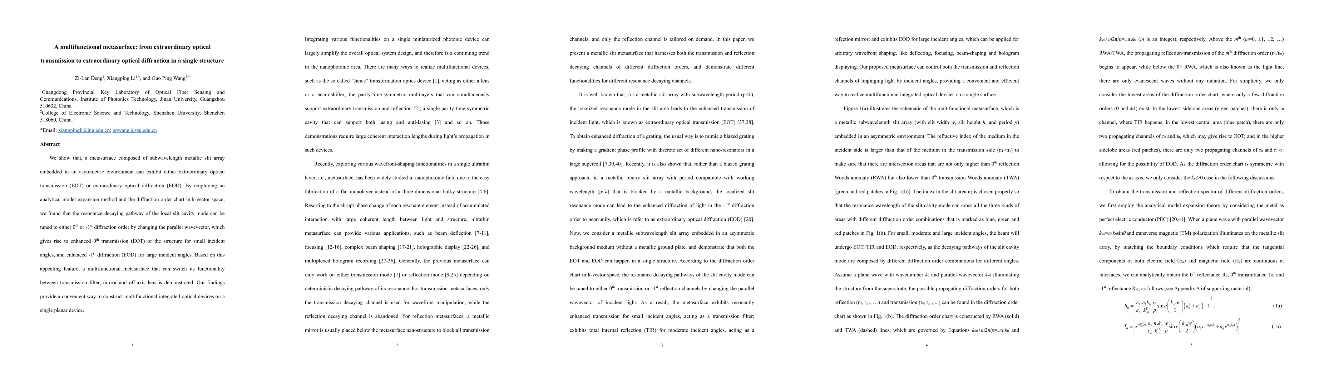 This paper demonstrates a multifunctional metasurface that can switch between extraordinary optical transmission and extraordinary optical diffraction by tuning the parallel wavevector. The metasurface, composed of a subwavelength metallic slit array, exhibits enhanced 0th transmission for small angles and enhanced -1st diffraction for larger angles, enabling it to function as a transmission filter, mirror, and off-axis lens.