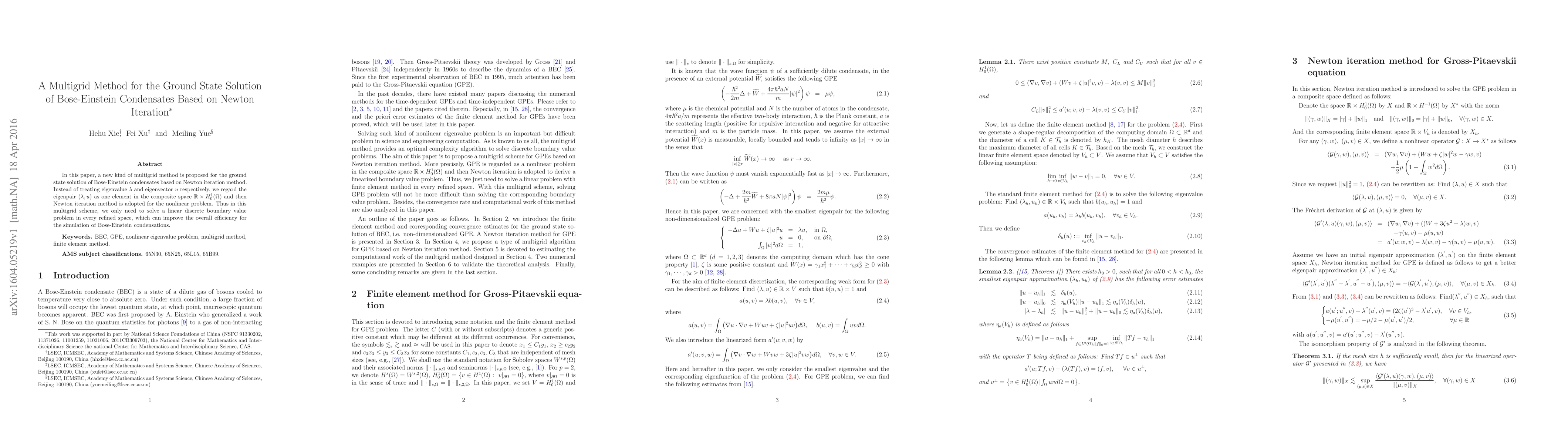 This paper introduces a new multigrid method for finding the ground state solution of Bose-Einstein condensates using Newton iteration. It treats the eigenpair as a single element in a composite space, improving efficiency by solving only linear problems in each refinement level.