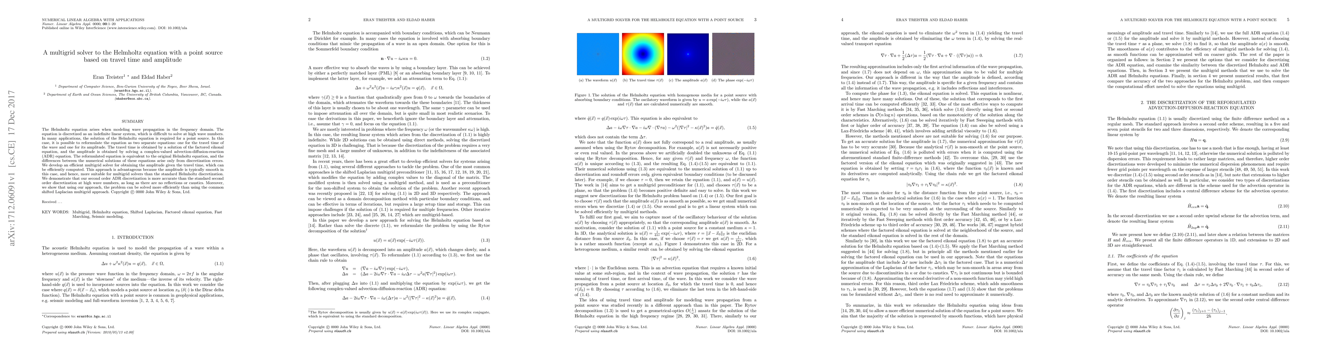 The Helmholtz equation arises when modeling wave propagation in the frequency domain. The equation is discretized as an indefinite linear system, which is difficult to solve at high wave numbers. In many applications, the solution of the Helmholtz equation is required for a point source. In this case, it is possible to reformulate the equation as two separate equations: one for the travel time of the wave and one for its amplitude. The travel time is obtained by a solution of the factored eikonal equation, and the amplitude is obtained by solving a complex-valued advection-diffusion-reaction (ADR) equation. The reformulated equation is equivalent to the original Helmholtz equation, and the differences between the numerical solutions of these equations arise only from discretization errors. We develop an efficient multigrid solver for obtaining the amplitude given the travel time, which can be efficiently computed. This approach is advantageous because the amplitude is typically smooth in this case, and hence, more suitable for multigrid solvers than the standard Helmholtz discretization. We demonstrate that our second order ADR discretization is more accurate than the standard second order discretization at high wave numbers, as long as there are no reflections or caustics. Moreover, we show that using our approach, the problem can be solved more efficiently than using the common shifted Laplacian multigrid approach.