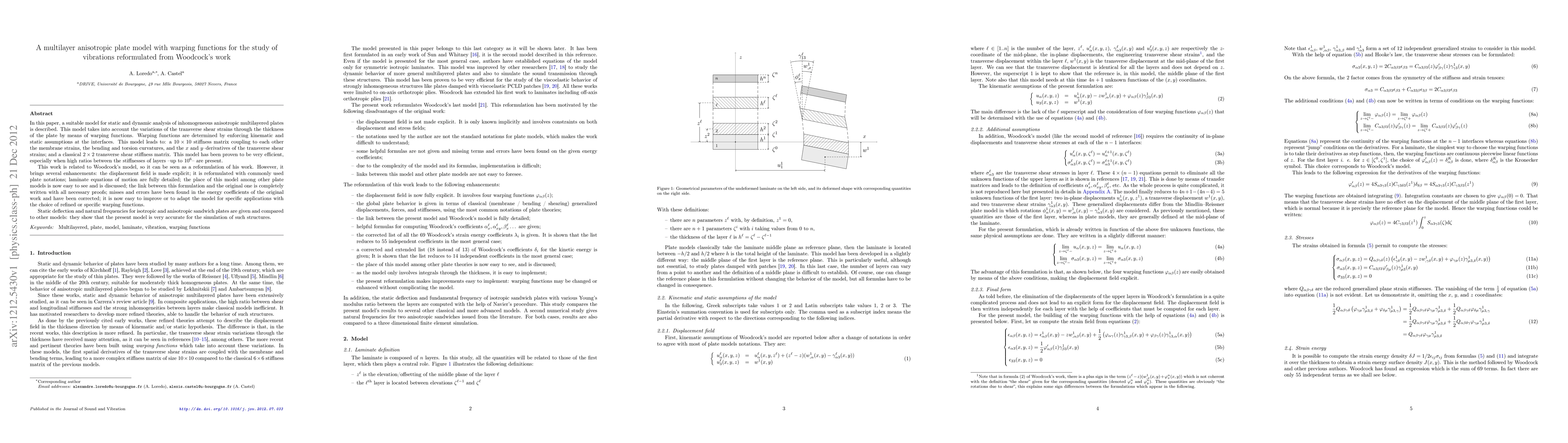 In this paper, a plate model suitable for static and dynamic analysis of inhomogeneous anisotropic multilayered plates is described. This model takes transverse shear variation through the thickness of the plate into account by means of warping functions which are determined by enforcing kinematic and static assumptions at the layers interfaces. This model leads to a 10 x 10 behavior matrix in which membrane strains, bending curvatures, and transverse shear x and y-derivatives are coupled, and to a classical 2 x 2 shear behavior matrix. This model has been proven to be very efficient, especially when high ratios -up to 10E5- between the stiffnesses of layers are present. This work is related to Woodcock's model, so it can be seen as a reformulation of his work. However, it propose several enhancements: the displacement field is made explicit; it is reformulated with commonly used plate notations; laminate equations of motion are fully detailed; the place of this model relatively to other plate models is now easy to see and is discussed; the link between this formulation and the original one is completely written with all necessary proofs; misses and errors have been found in the energy coefficients of the original work, and then have been corrected; it is now easy to improve or to adapt the model for specific applications with the choice of refined or specific warping functions.