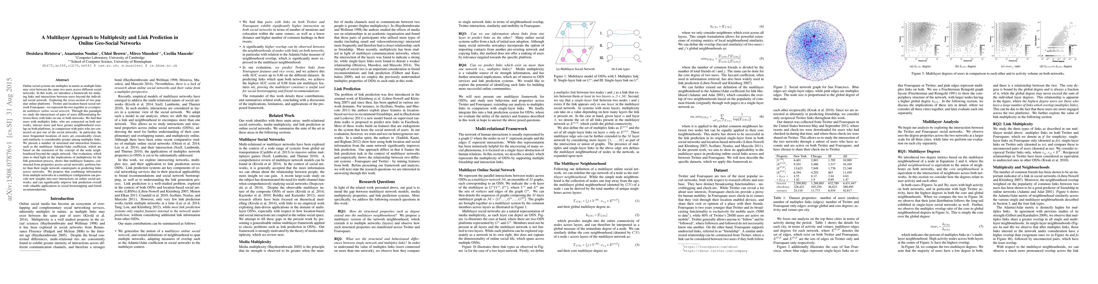 This paper introduces a framework for analyzing interactions across multiple online social networks, specifically Twitter and Foursquare, to study multiplex links. It finds that users with connections on both platforms interact more and exhibit greater neighborhood overlap compared to those connected on just one. The study proposes multilayer features for link prediction, showing they outperform single-network features, suggesting multilayer approaches can significantly improve link prediction and enhance social recommendations.