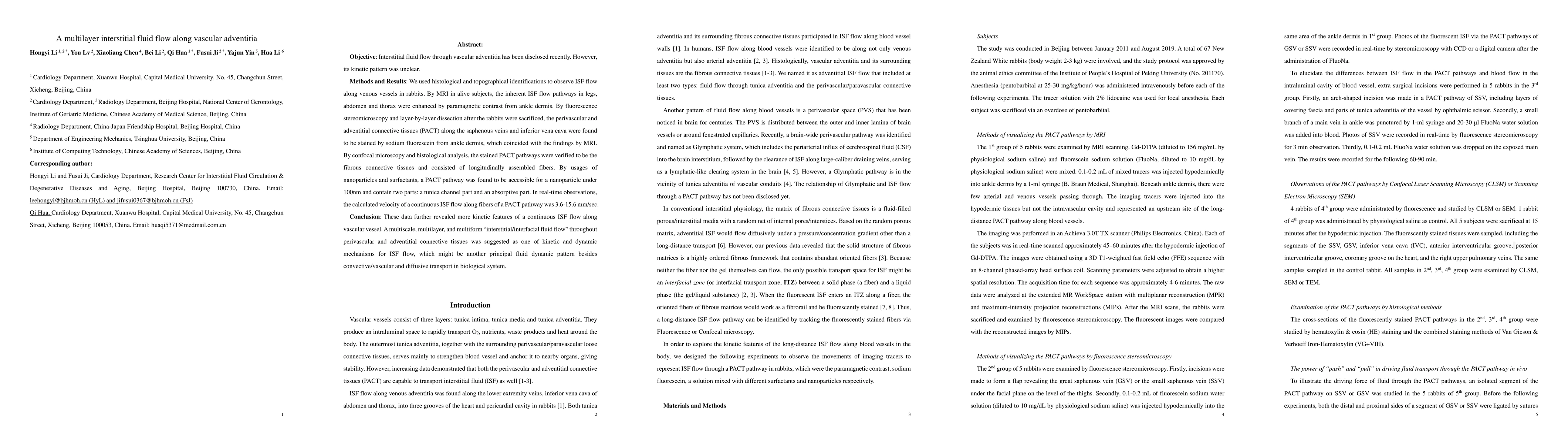 Objective: Interstitial fluid flow through vascular adventitia has been disclosed recently. However, its kinetic pattern was unclear. Methods and Results: We used histological and topographical identifications to observe ISF flow along venous vessels in rabbits. By MRI in alive subjects, the inherent ISF flow pathways in legs, abdomen and thorax were enhanced by paramagnetic contrast from ankle dermis. By fluorescence stereomicroscopy and layer-by-layer dissection after the rabbits were sacrificed, the perivascular and adventitial connective tissues (PACT) along the saphenous veins and inferior vena cava were found to be stained by sodium fluorescein from ankle dermis, which coincided with the findings by MRI. By confocal microscopy and histological analysis, the stained PACT pathways were verified to be the fibrous connective tissues and consisted of longitudinally assembled fibers. By usages of nanoparticles and surfactants, a PACT pathway was found to be accessible for a nanoparticle under 100nm and contain two parts: a tunica channel part and an absorptive part. In real-time observations, the calculated velocity of a continuous ISF flow along fibers of a PACT pathway was 3.6-15.6 mm/sec. Conclusion: These data further revealed more kinetic features of a continuous ISF flow along vascular vessel. A multiscale, multilayer, and multiform interstitial/interfacial fluid flow throughout perivascular and adventitial connective tissues was suggested as one of kinetic and dynamic mechanisms for ISF flow, which might be another principal fluid dynamic pattern besides convective/vascular and diffusive transport in biological system.