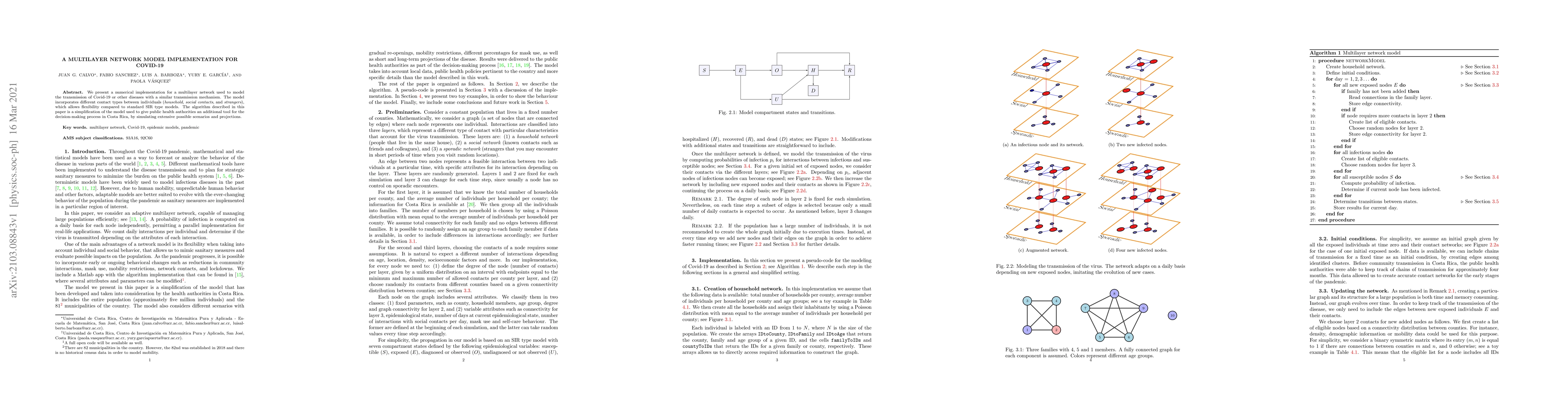 We present a numerical implementation for a multilayer network used to model the transmission of Covid-19 or other diseases with a similar transmission mechanism. The model incorporates different contact types between individuals (household, social contacts, and strangers), which allows flexibility compared to standard SIR type models. The algorithm described in this paper is a simplification of the model used to give public health authorities an additional tool for the decision-making process in Costa Rica, by simulating extensive possible scenarios and projections.