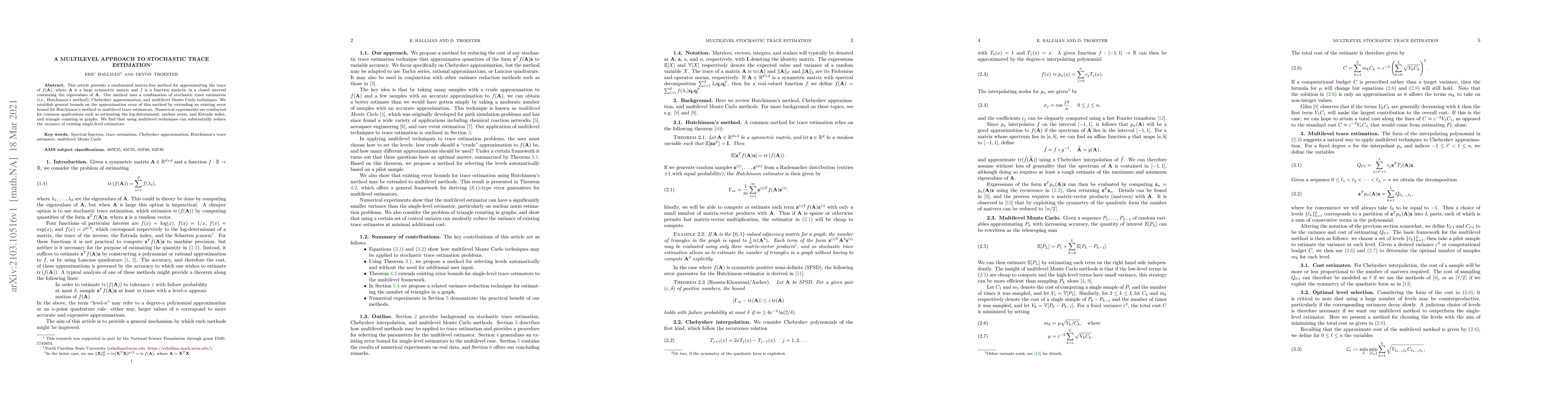 This paper introduces a randomized matrix-free method combining stochastic trace estimation, Chebyshev approximation, and multilevel Monte Carlo techniques to approximate the trace of functions of large symmetric matrices. It demonstrates that multilevel approaches can significantly reduce the variance of single-level estimators in applications like estimating the log-determinant and nuclear norm.