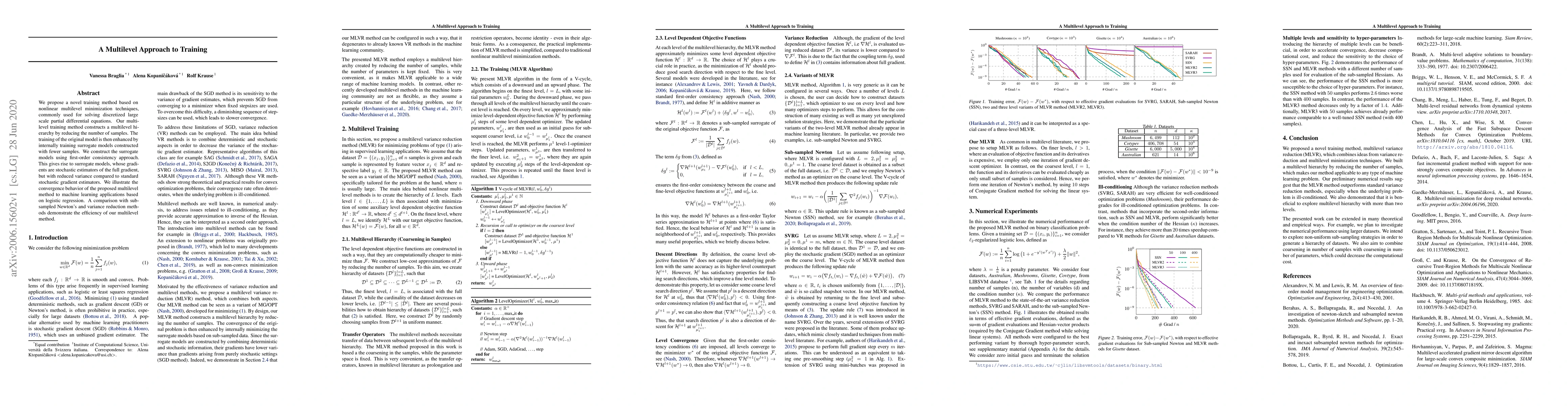 We propose a novel training method based on nonlinear multilevel minimization techniques, commonly used for solving discretized large scale partial differential equations. Our multilevel training method constructs a multilevel hierarchy by reducing the number of samples. The training of the original model is then enhanced by internally training surrogate models constructed with fewer samples. We construct the surrogate models using first-order consistency approach. This gives rise to surrogate models, whose gradients are stochastic estimators of the full gradient, but with reduced variance compared to standard stochastic gradient estimators. We illustrate the convergence behavior of the proposed multilevel method to machine learning applications based on logistic regression. A comparison with subsampled Newton's and variance reduction methods demonstrate the efficiency of our multilevel method.
