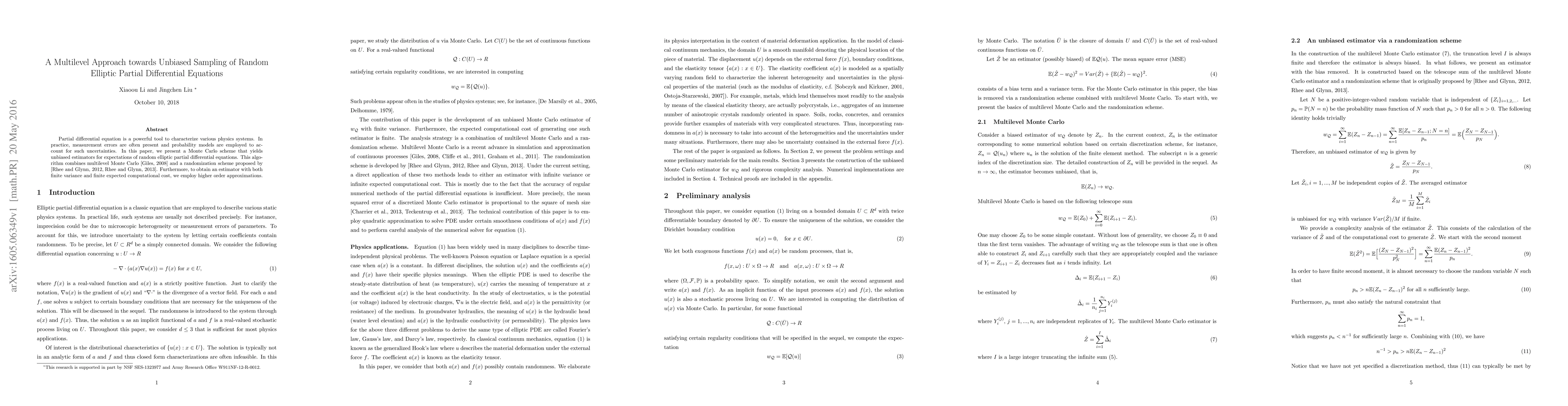 This paper proposes a Monte Carlo scheme combining multilevel Monte Carlo and a randomization technique to obtain unbiased estimators for random elliptic partial differential equations, incorporating higher order approximations to achieve finite variance and computational cost.