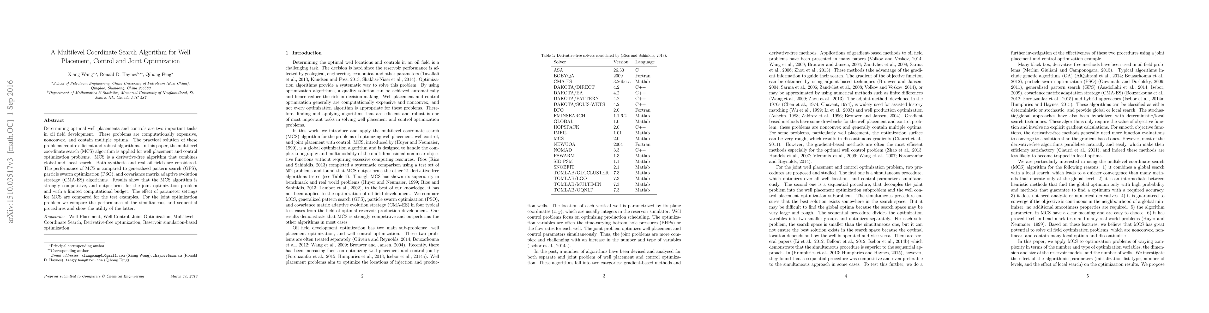 This paper proposes a multilevel coordinate search (MCS) algorithm for optimizing well placement and control in oil field development, demonstrating its effectiveness through comparisons with GPS, PSO, and CMA-ES. The MCS algorithm outperforms others for joint optimization within limited computational resources, and the study highlights the benefits of sequential procedures over simultaneous ones.