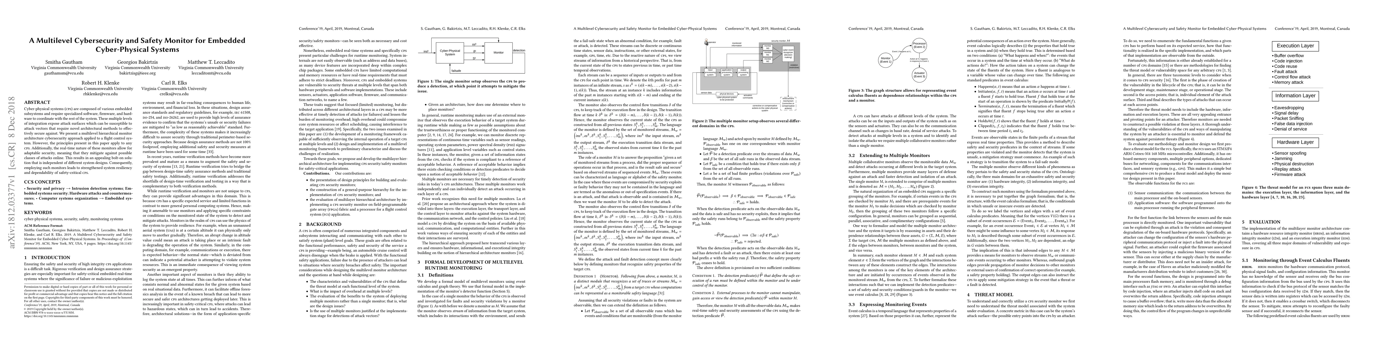 This paper proposes a multilevel cybersecurity monitor architecture for embedded cyber-physical systems, demonstrating its application in a flight control system. The architecture provides adaptable, real-time security that enhances the resiliency and dependability of safety-critical systems.