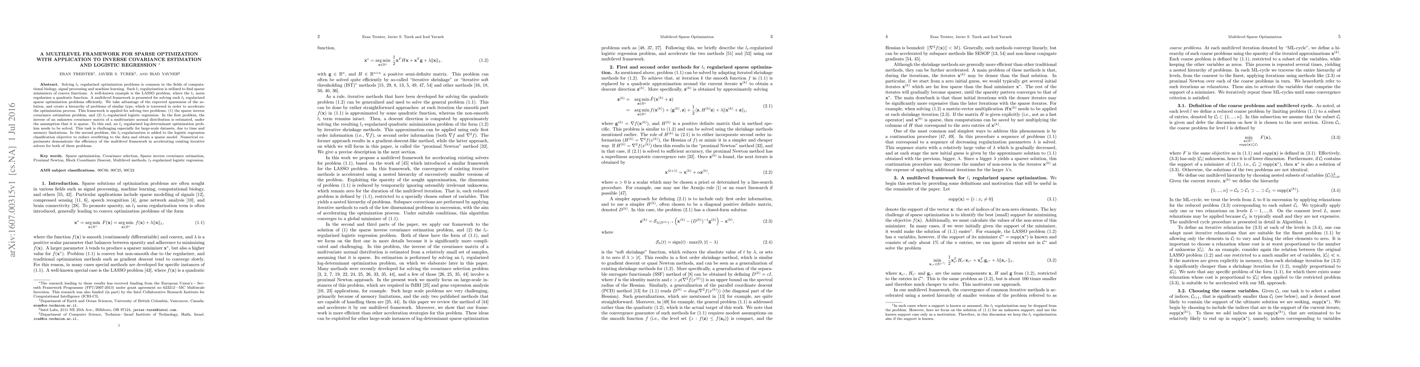 This paper introduces a multilevel framework for efficiently solving l1 regularized sparse optimization problems, applying it to sparse inverse covariance estimation and l1-regularized logistic regression. The framework leverages the expected sparseness of solutions to create a hierarchy of problems, significantly accelerating the optimization process.