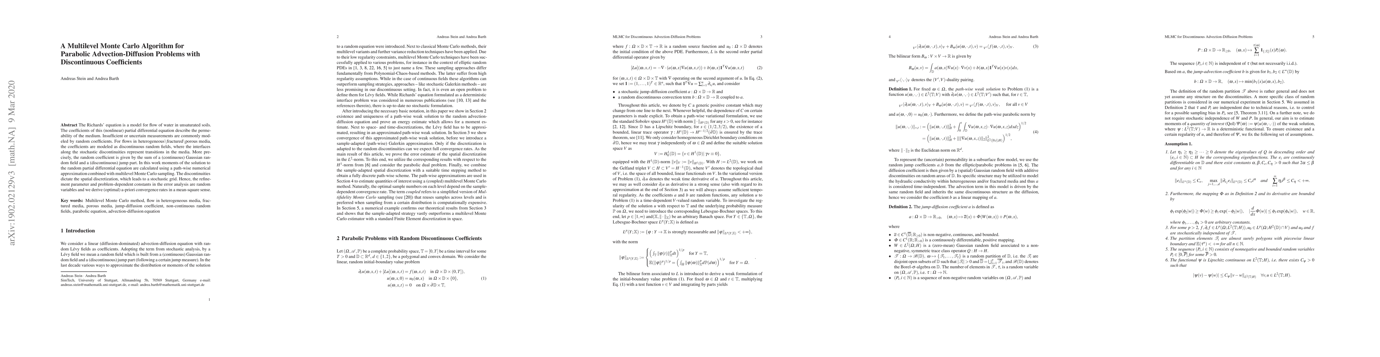 This paper proposes a multilevel Monte Carlo algorithm to solve parabolic advection-diffusion problems with discontinuous coefficients, modeling water flow in unsaturated soils. The method combines path-wise numerical approximation with multilevel Monte Carlo sampling to calculate moments of the solution, providing optimal a-priori convergence rates in a mean-square sense.