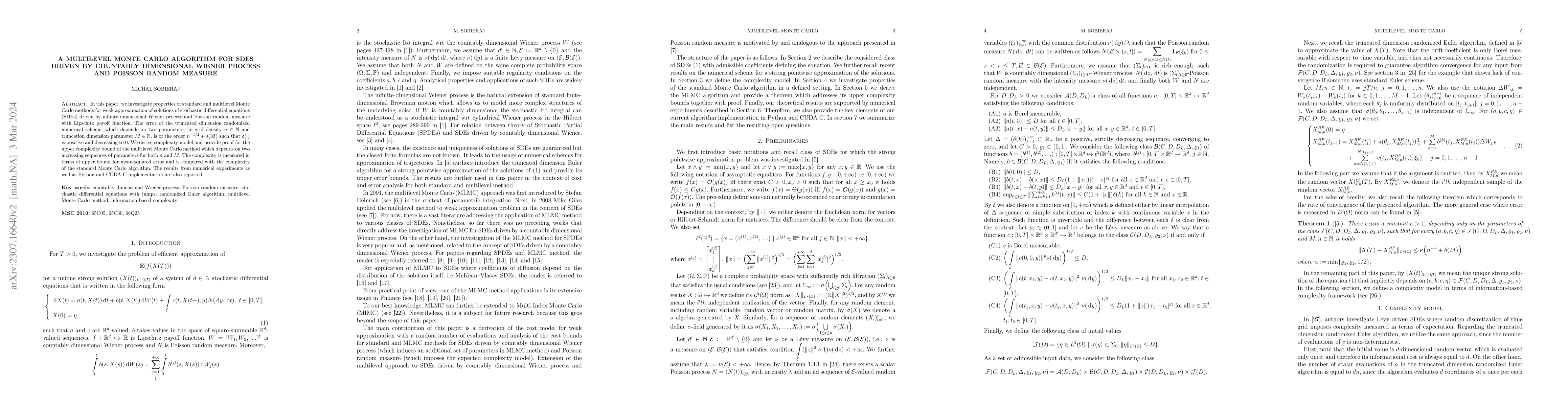 In this paper, we investigate the properties of standard and multilevel Monte Carlo methods for weak approximation of solutions of stochastic differential equations (SDEs) driven by the infinite-dimensional Wiener process and Poisson random measure with Lipschitz payoff function. The error of the truncated dimension randomized numerical scheme, which is determined by two parameters, i.e grid density $n \in \mathbb{N}_{+}$ and truncation dimension parameter $M \in \mathbb{N}_{+},$ is of the order $n^{-1/2}+\delta(M)$ such that $\delta(\cdot)$ is positive and decreasing to $0$. We derive complexity model and provide proof for the upper complexity bound of the multilevel Monte Carlo method which depends on two increasing sequences of parameters for both $n$ and $M.$ The complexity is measured in terms of upper bound for mean-squared error and compared with the complexity of the standard Monte Carlo algorithm. The results from numerical experiments as well as Python and CUDA C implementation are also reported.