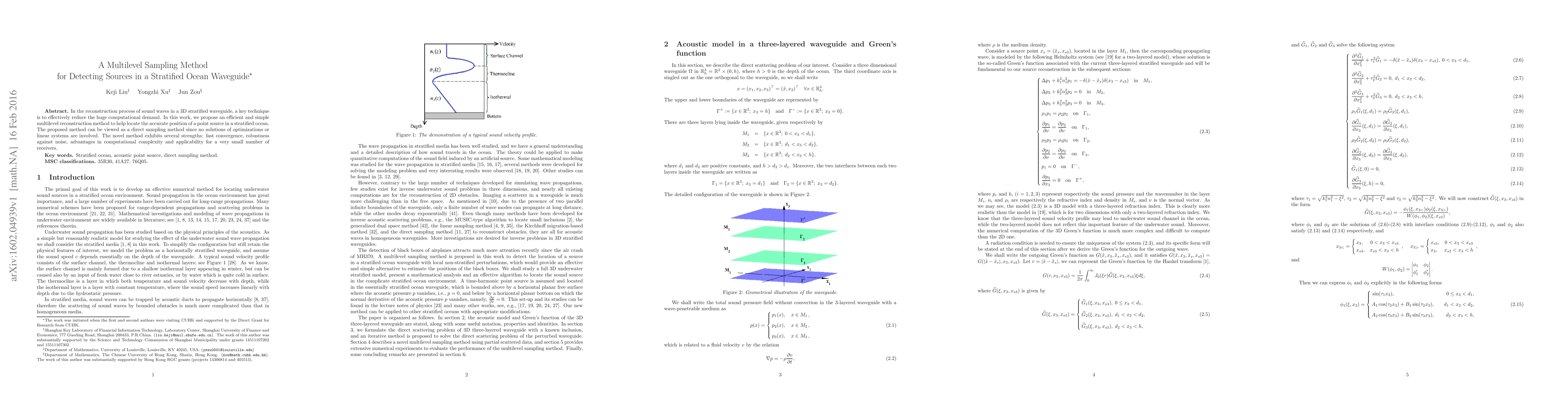 In the reconstruction process of sound waves in a 3D stratified waveguide, a key technique is to effectively reduce the huge computational demand. In this work, we propose an efficient and simple multilevel reconstruction method to help locate the accurate position of a point source in a stratified ocean. The proposed method can be viewed as a direct sampling method since no solutions of optimizations or linear systems are involved. The novel method exhibits several strengths: fast convergence, robustness against noise, advantages in computational complexity and applicability for a very small number of receivers.