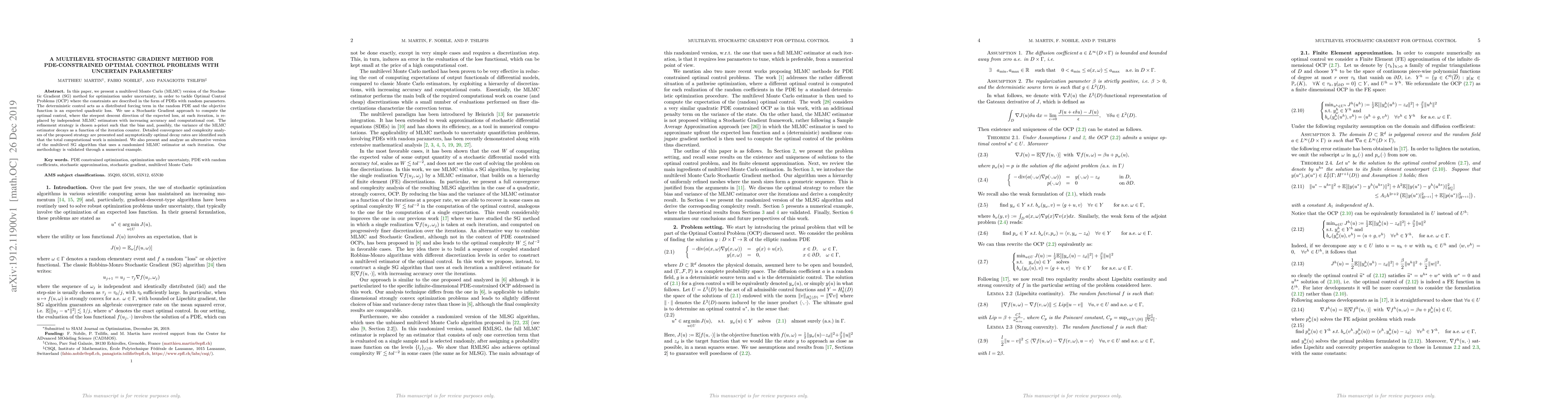 This paper proposes a multilevel Monte Carlo version of the Stochastic Gradient method to solve PDE-constrained optimal control problems with uncertain parameters, achieving optimal convergence and computational efficiency. The method uses MLMC estimators to minimize total computational work while ensuring bias and variance decay.