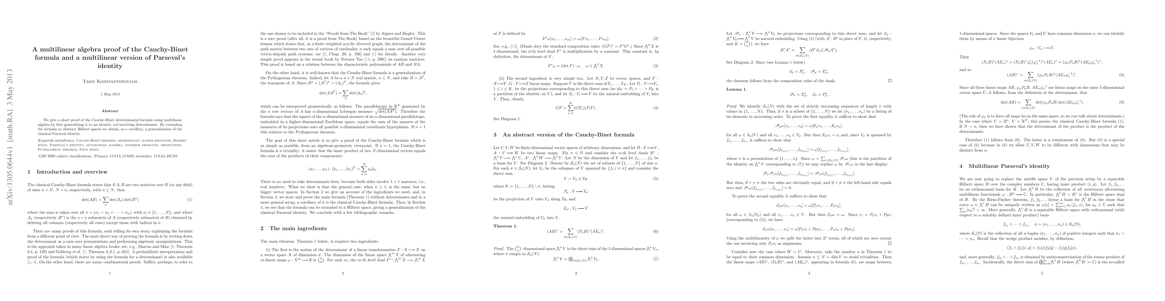 Summary: This paper presents a multilinear algebra proof of the Cauchy-Binet formula, generalizes it to abstract Hilbert spaces, and derives a multilinear version of Parseval's identity as a corollary. The approach avoids determinants and extends the classical results to a broader context.