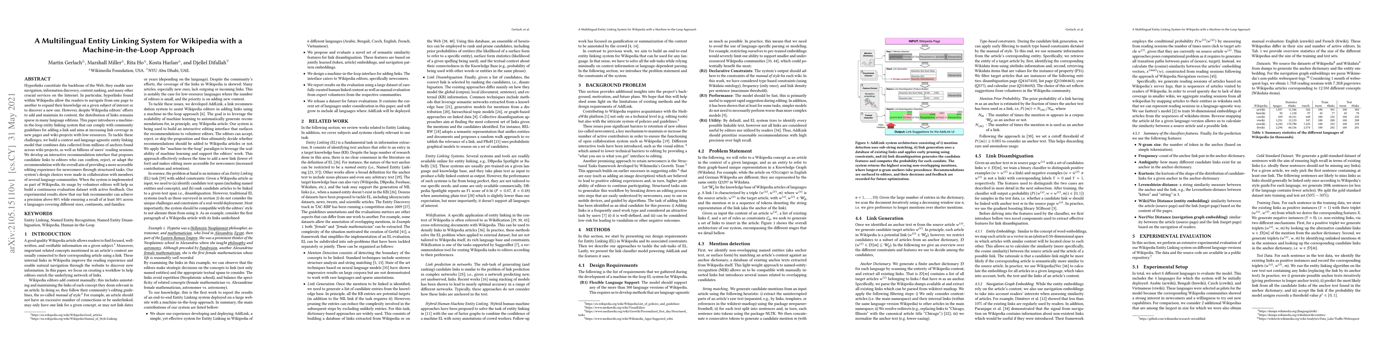 This paper presents a multilingual entity linking system for Wikipedia that employs a machine-in-the-loop approach to enhance link coverage in low-resource language editions. The system combines data from millions of anchors and user reading sessions to propose links to editors, achieving over 80% precision and at least 50% recall across six languages.