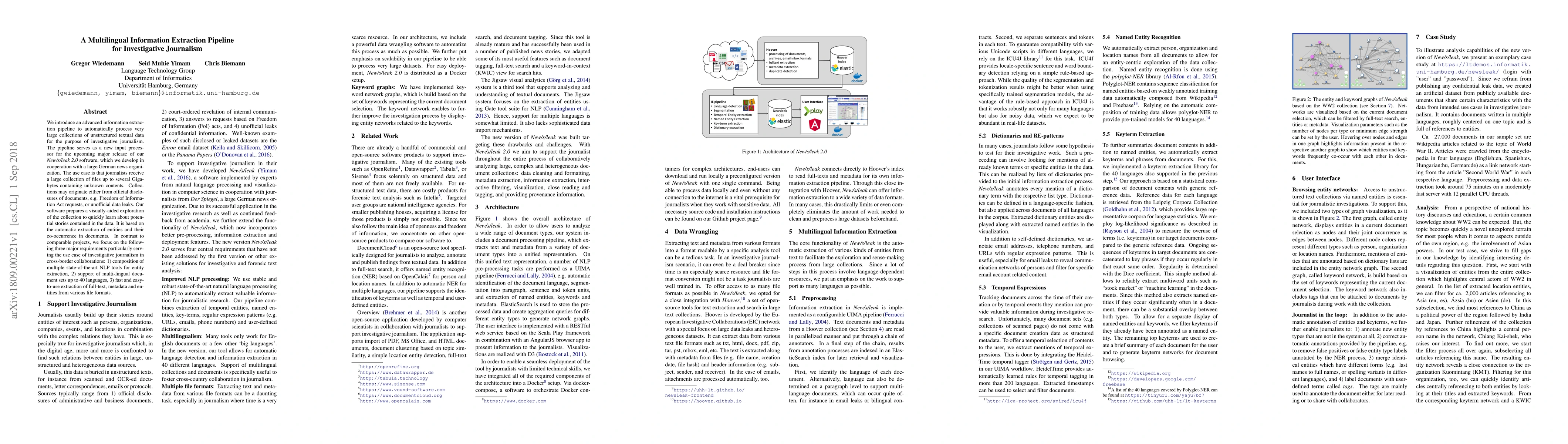 We introduce an advanced information extraction pipeline to automatically process very large collections of unstructured textual data for the purpose of investigative journalism. The pipeline serves as a new input processor for the upcoming major release of our New/s/leak 2.0 software, which we develop in cooperation with a large German news organization. The use case is that journalists receive a large collection of files up to several Gigabytes containing unknown contents. Collections may originate either from official disclosures of documents, e.g. Freedom of Information Act requests, or unofficial data leaks. Our software prepares a visually-aided exploration of the collection to quickly learn about potential stories contained in the data. It is based on the automatic extraction of entities and their co-occurrence in documents. In contrast to comparable projects, we focus on the following three major requirements particularly serving the use case of investigative journalism in cross-border collaborations: 1) composition of multiple state-of-the-art NLP tools for entity extraction, 2) support of multi-lingual document sets up to 40 languages, 3) fast and easy-to-use extraction of full-text, metadata and entities from various file formats.