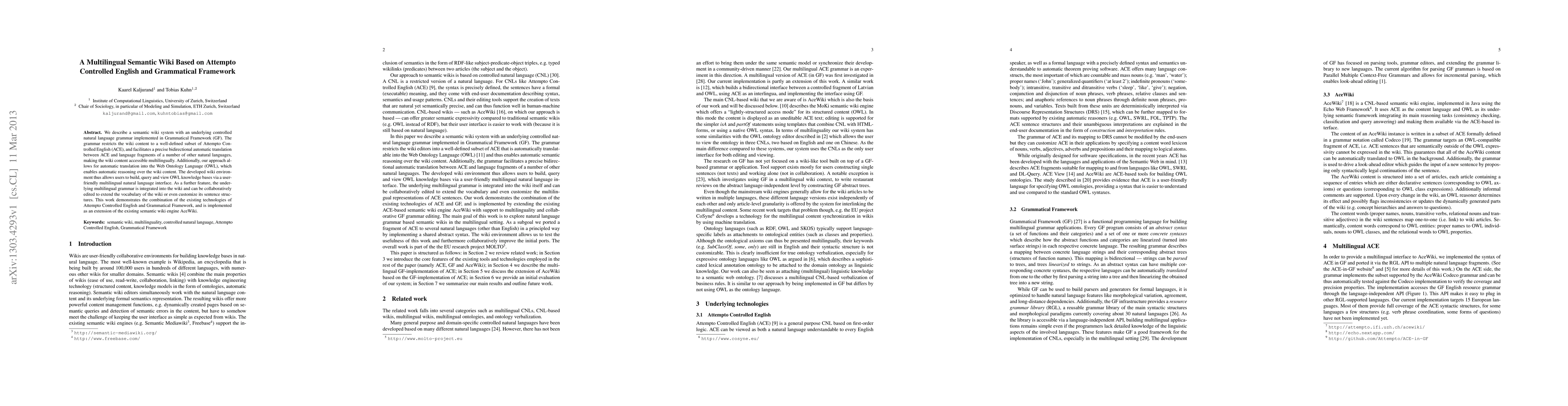 The paper presents a multilingual semantic wiki system using Attempto Controlled English and Grammatical Framework, enabling precise automatic translations and reasoning over content in multiple languages and OWL. Users can collaboratively edit the underlying grammar to extend the wiki's vocabulary and customize its structures.