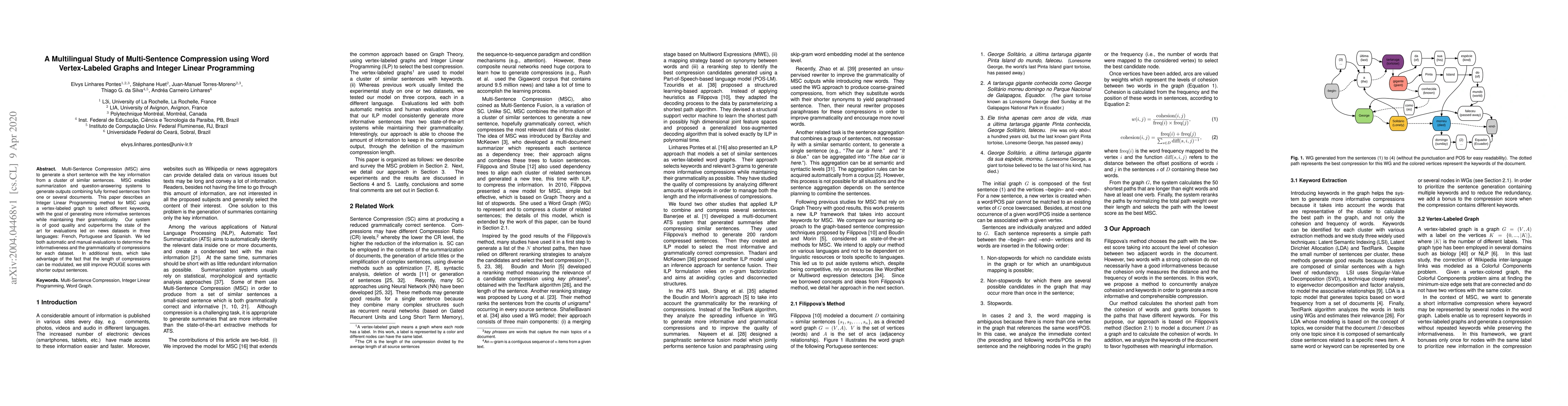 Multi-Sentence Compression (MSC) aims to generate a short sentence with the key information from a cluster of similar sentences. MSC enables summarization and question-answering systems to generate outputs combining fully formed sentences from one or several documents. This paper describes an Integer Linear Programming method for MSC using a vertex-labeled graph to select different keywords, with the goal of generating more informative sentences while maintaining their grammaticality. Our system is of good quality and outperforms the state of the art for evaluations led on news datasets in three languages: French, Portuguese and Spanish. We led both automatic and manual evaluations to determine the informativeness and the grammaticality of compressions for each dataset. In additional tests, which take advantage of the fact that the length of compressions can be modulated, we still improve ROUGE scores with shorter output sentences.