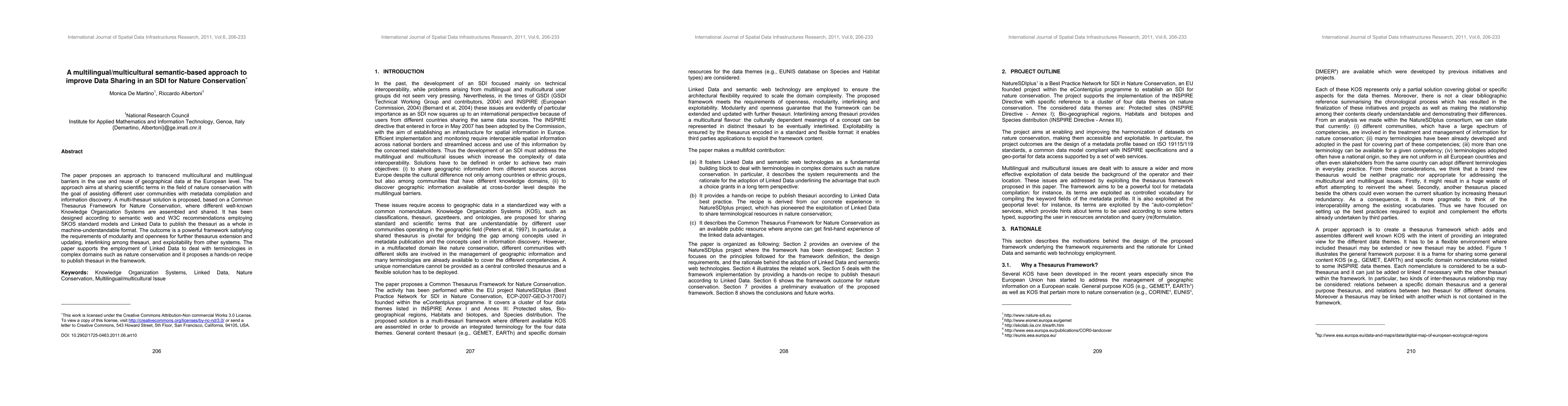 The paper proposes an approach to transcend multicultural and multilingual barriers in the use and reuse of geographical data at the European level. The approach aims at sharing scientific terms in the field of nature conservation with the goal of assisting different user communities with metadata compilation and information discovery. A multi-thesauri solution is proposed, based on a Common Thesaurus Framework for Nature Conservation, where different well-known Knowledge Organization Systems are assembled and shared. It has been designed according to semantic web and W3C recommendations employing SKOS standard models and Linked Data to publish the thesauri as a whole in machine-understandable format. The outcome is a powerful framework satisfying the requirements of modularity and openness for further thesaurus extension and updating, interlinking among thesauri, and exploitability from other systems. The paper supports the employment of Linked Data to deal with terminologies in complex domains such as nature conservation and it proposes a hands-on recipe to publish thesauri in the framework.