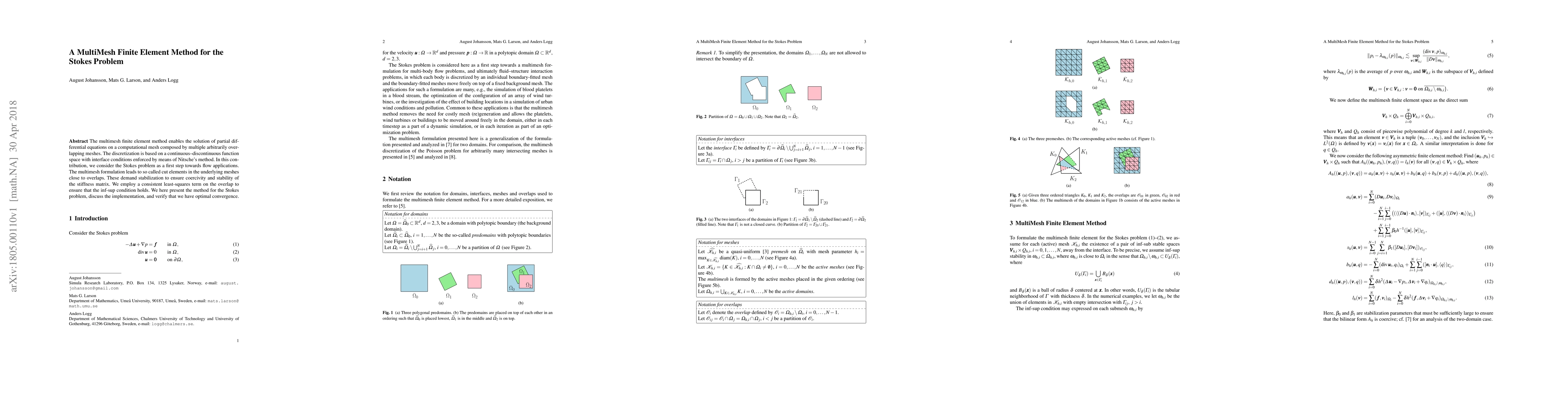 This paper introduces a multimesh finite element method for solving the Stokes problem, utilizing a continuous-discontinuous function space with Nitsche's method for interface conditions. The method employs stabilization techniques and a consistent least-squares term to ensure stability and optimal convergence.