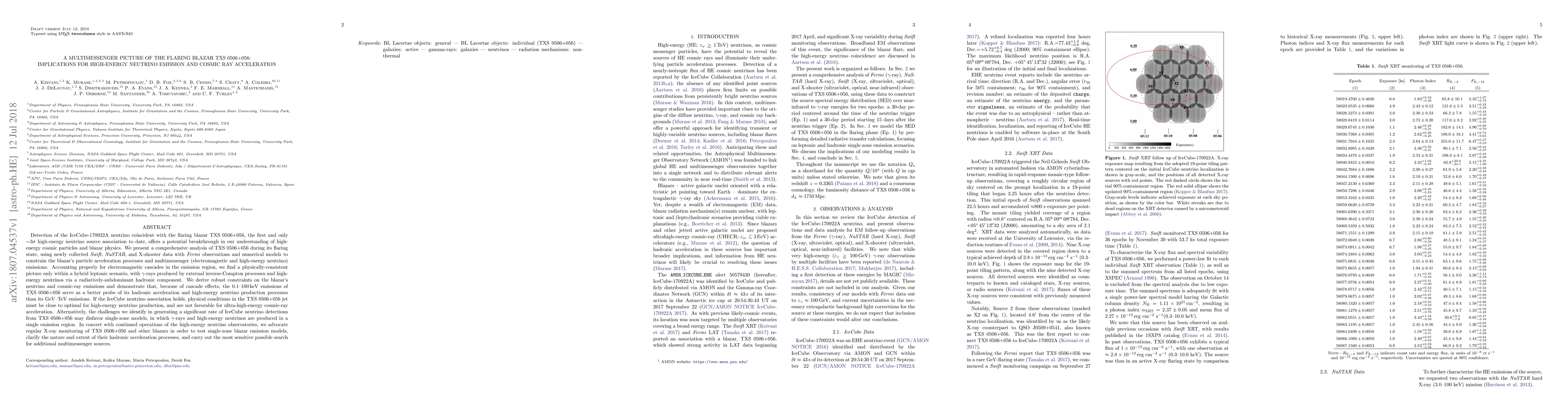 This paper analyzes the flaring blazar TXS 0506+056, linking its high-energy neutrino emission to the IceCube-170922A detection, and uses multimessenger data to explore its particle acceleration and cosmic ray processes. The study finds a hybrid leptonic scenario best fits the observed emissions, suggesting optimal conditions for neutrino production but not for ultra-high-energy cosmic rays.