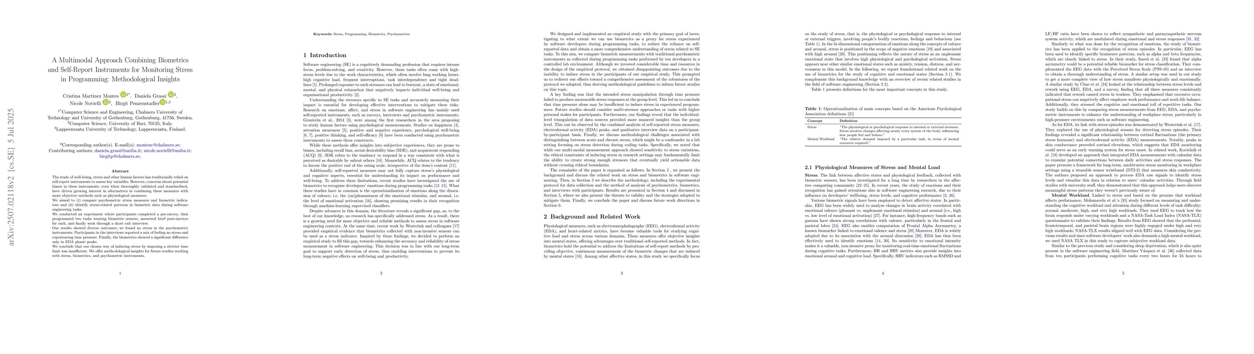 The study of well-being, stress and other human factors has traditionally relied on self-report instruments to assess key variables. However, concerns about potential biases in these instruments, even when thoroughly validated and standardised, have driven growing interest in alternatives in combining these measures with more objective methods, such as physiological measures. We aimed to (i) compare psychometric stress measures and biometric indicators and (ii) identify stress-related patterns in biometric data during software engineering tasks. We conducted an experiment where participants completed a pre-survey, then programmed two tasks wearing biometric sensors, answered brief post-surveys for each, and finally went through a short exit interview. Our results showed diverse outcomes; we found no stress in the psychometric instruments. Participants in the interviews reported a mix of feeling no stress and experiencing time pressure. Finally, the biometrics showed a significant difference only in EDA phasic peaks. We conclude that our chosen way of inducing stress by imposing a stricter time limit was insufficient. We offer methodological insights for future studies working with stress, biometrics, and psychometric instruments.
