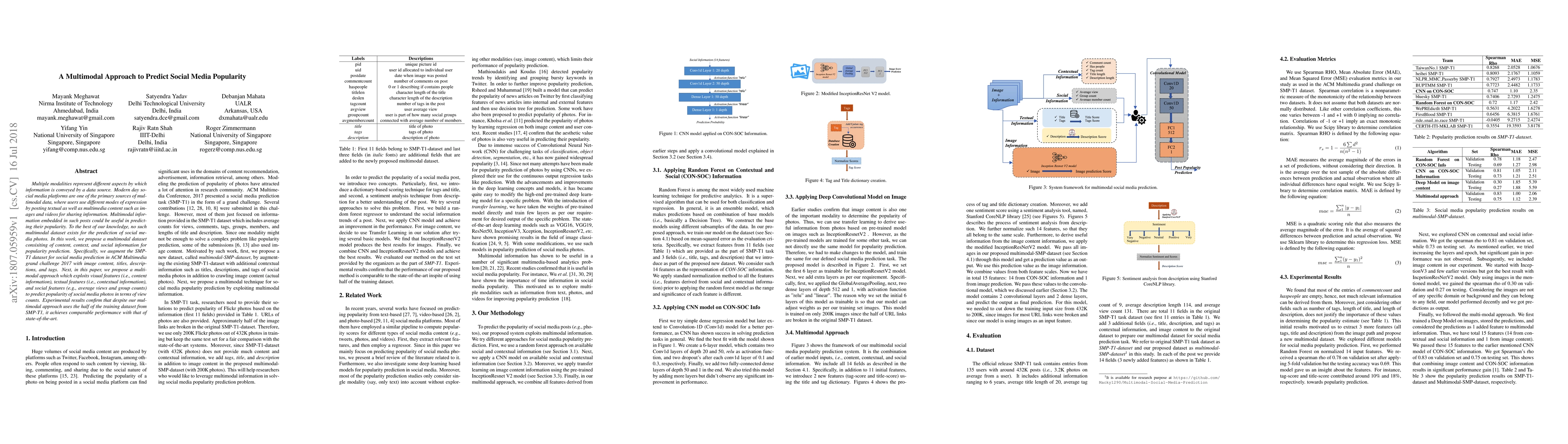 This paper proposes a multimodal dataset and approach to predict the popularity of social media photos by integrating visual, textual, and social features. Despite using half the training data from an existing dataset, the proposed method achieves comparable performance to state-of-the-art techniques.