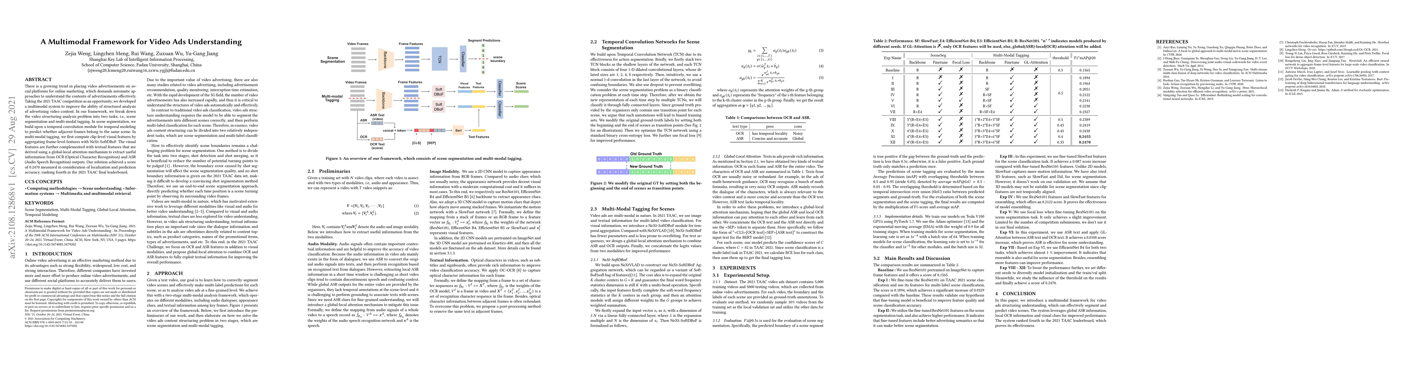 A new multimodal framework for understanding video ads was developed to improve analysis of advertising content. It achieved a score of 0.2470 in a competition, ranking fourth, using scene segmentation and multi-modal tagging tasks.