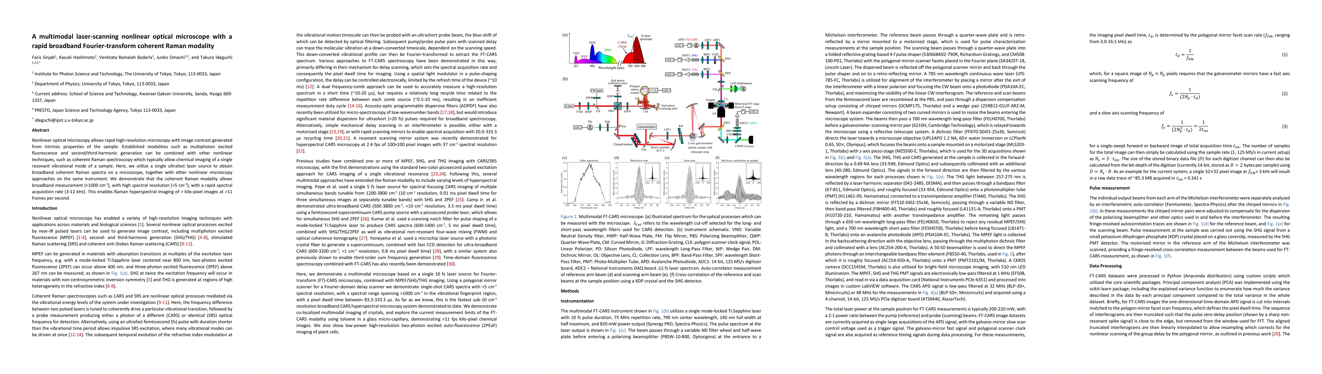 This paper presents a multimodal laser-scanning microscope integrating broadband Fourier-transform coherent Raman spectroscopy with other nonlinear optical techniques, enabling rapid high-resolution hyperspectral imaging at over 11 frames per second. The coherent Raman modality provides high spectral resolution and rapid acquisition rates, facilitating detailed chemical imaging.