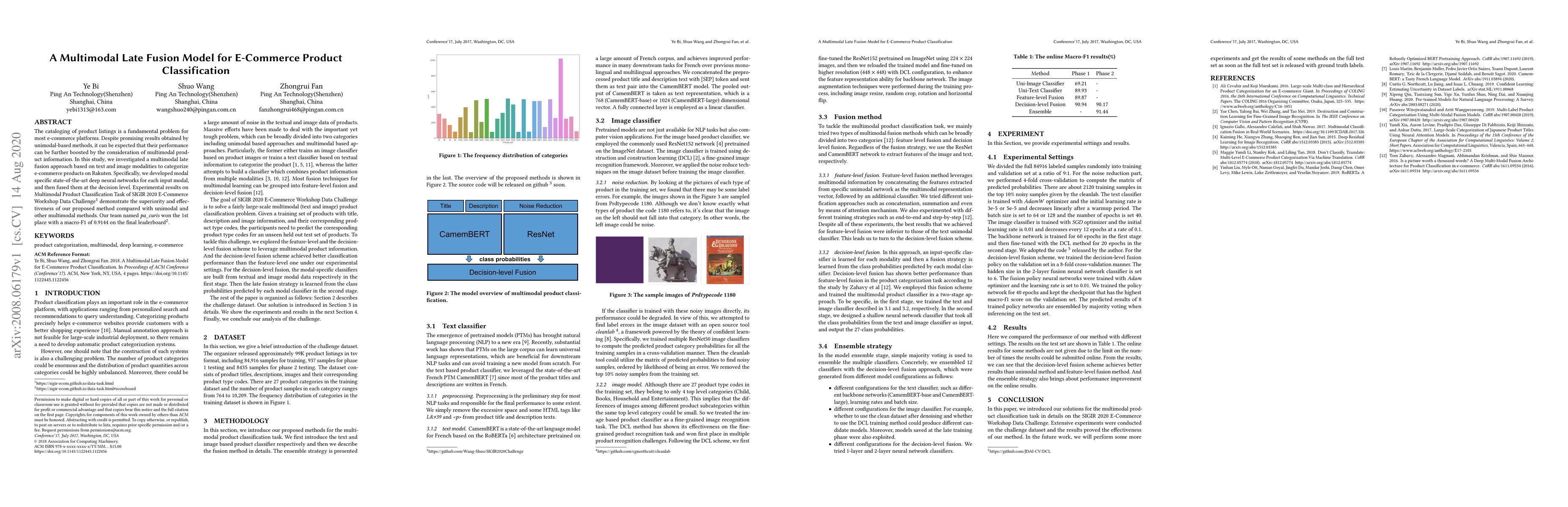 The cataloging of product listings is a fundamental problem for most e-commerce platforms. Despite promising results obtained by unimodal-based methods, it can be expected that their performance can be further boosted by the consideration of multimodal product information. In this study, we investigated a multimodal late fusion approach based on text and image modalities to categorize e-commerce products on Rakuten. Specifically, we developed modal specific state-of-the-art deep neural networks for each input modal, and then fused them at the decision level. Experimental results on Multimodal Product Classification Task of SIGIR 2020 E-Commerce Workshop Data Challenge demonstrate the superiority and effectiveness of our proposed method compared with unimodal and other multimodal methods. Our team named pa_curis won the 1st place with a macro-F1 of 0.9144 on the final leaderboard.