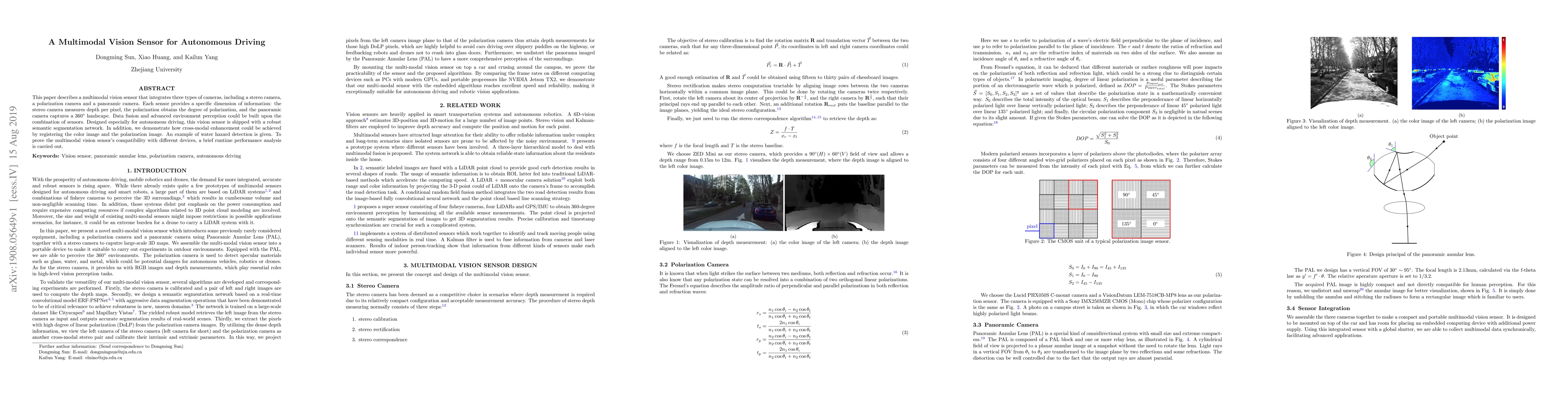 This paper presents a multimodal vision sensor for autonomous driving that integrates stereo, polarization, and panoramic cameras to provide depth, polarization, and 360-degree landscape information. The system employs a robust semantic segmentation network and demonstrates cross-modal enhancement, exemplified by water hazard detection, along with a runtime performance analysis.