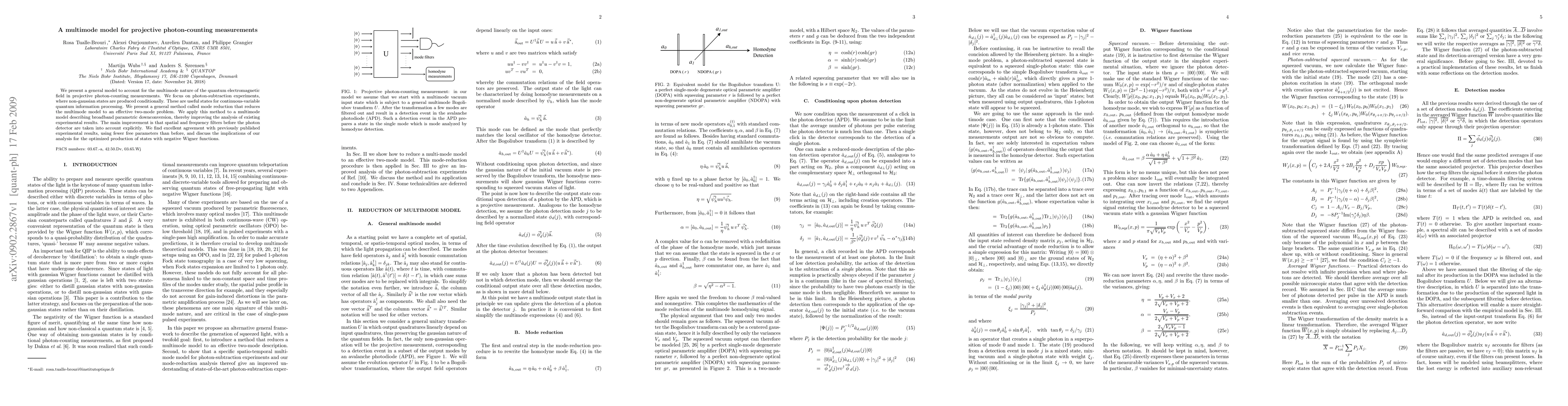 We present a general model to account for the multimode nature of the quantum electromagnetic field in projective photon-counting measurements. We focus on photon-subtraction experiments, where non-gaussian states are produced conditionally. These are useful states for continuous-variable quantum information processing. We present a general method called mode reduction that reduces the multimode model to an effective two-mode problem. We apply this method to a multimode model describing broadband parametric downconversion, thereby improving the analysis of existing experimental results. The main improvement is that spatial and frequency filters before the photon detector are taken into account explicitly. We find excellent agreement with previously published experimental results, using fewer free parameters than before, and discuss the implications of our analysis for the optimized production of states with negative Wigner functions.