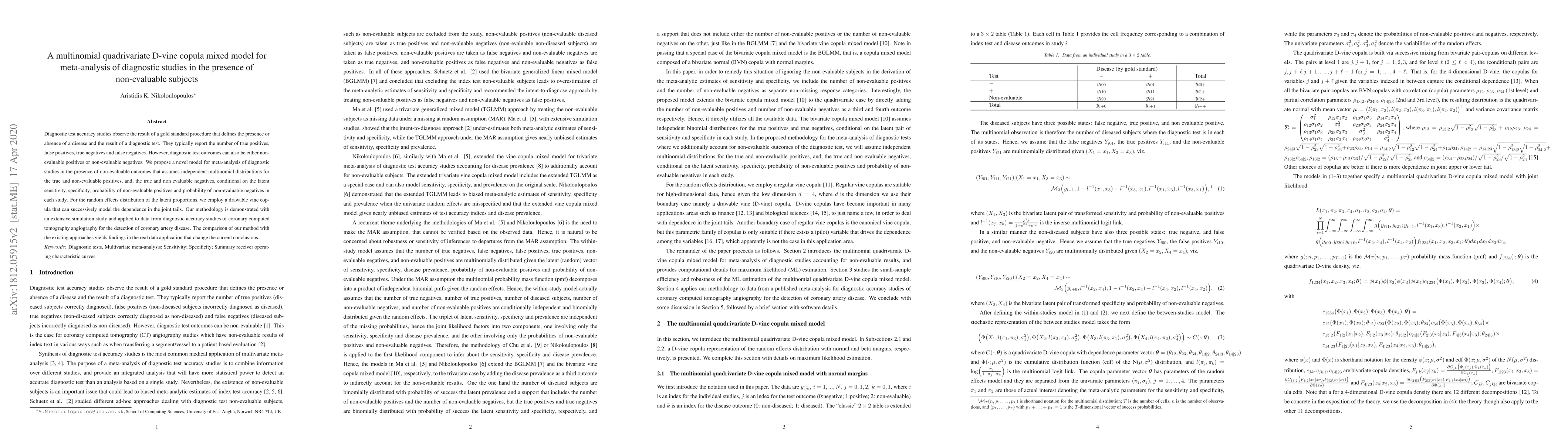 This paper proposes a novel multinomial quadrivariate D-vine copula mixed model for meta-analysis of diagnostic studies, accommodating non-evaluable outcomes. The model accounts for dependencies in joint tails and is demonstrated through simulations and applied to coronary computed tomography angiography studies, yielding different conclusions compared to existing methods.