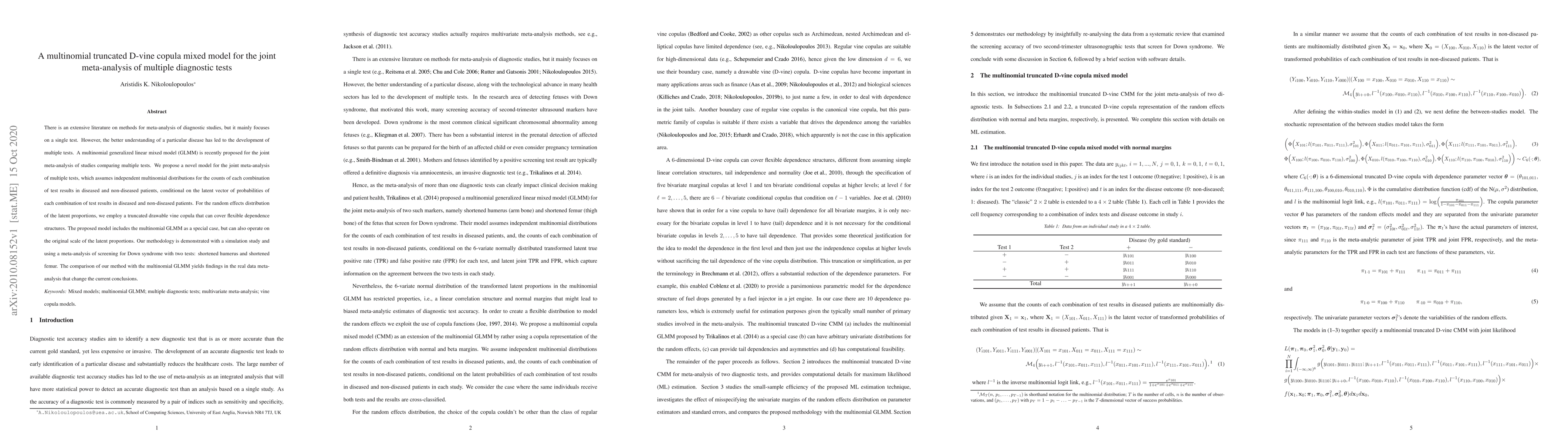 This paper proposes a novel multinomial truncated D-vine copula mixed model for joint meta-analysis of multiple diagnostic tests, offering a flexible dependence structure compared to existing methods. The model is demonstrated through simulation and a real-world application to Down syndrome screening, yielding different conclusions than previous methods.