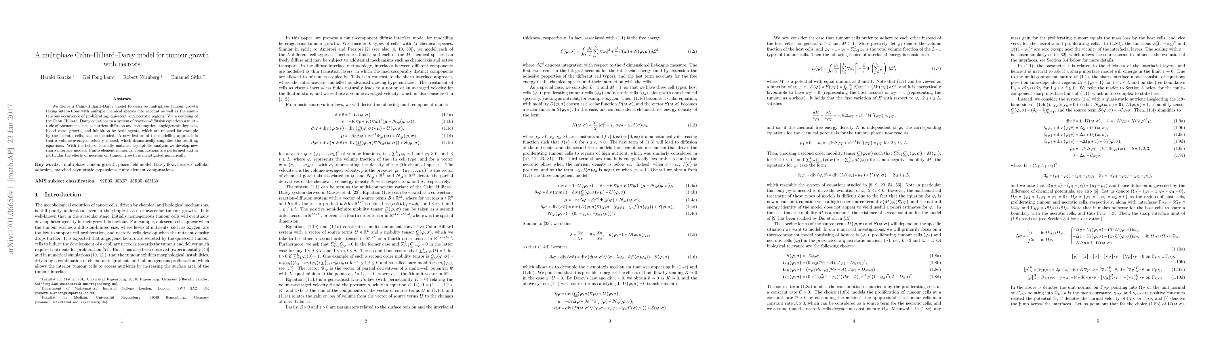 This paper develops a Cahn-Hilliard-Darcy model to simulate multiphase tumour growth, incorporating interactions with various chemical species and different tumour regions. The model simplifies complex phenomena like nutrient diffusion and angiogenesis, and uses matched asymptotic analysis to derive sharp interface models, with numerical simulations highlighting the impact of necrosis on tumour dynamics.